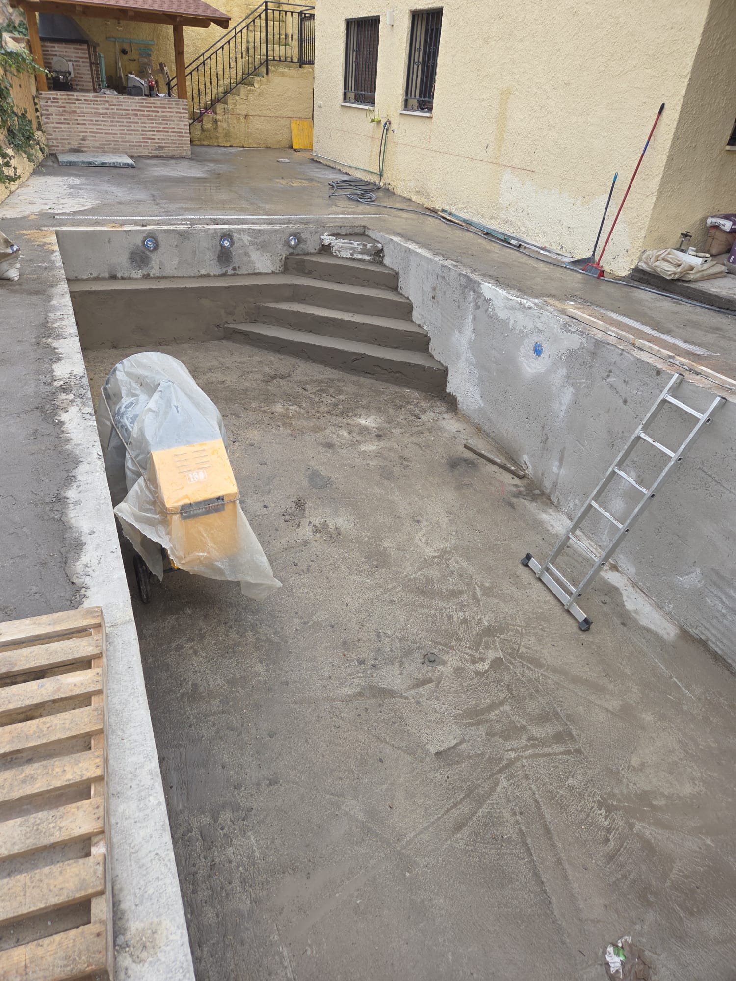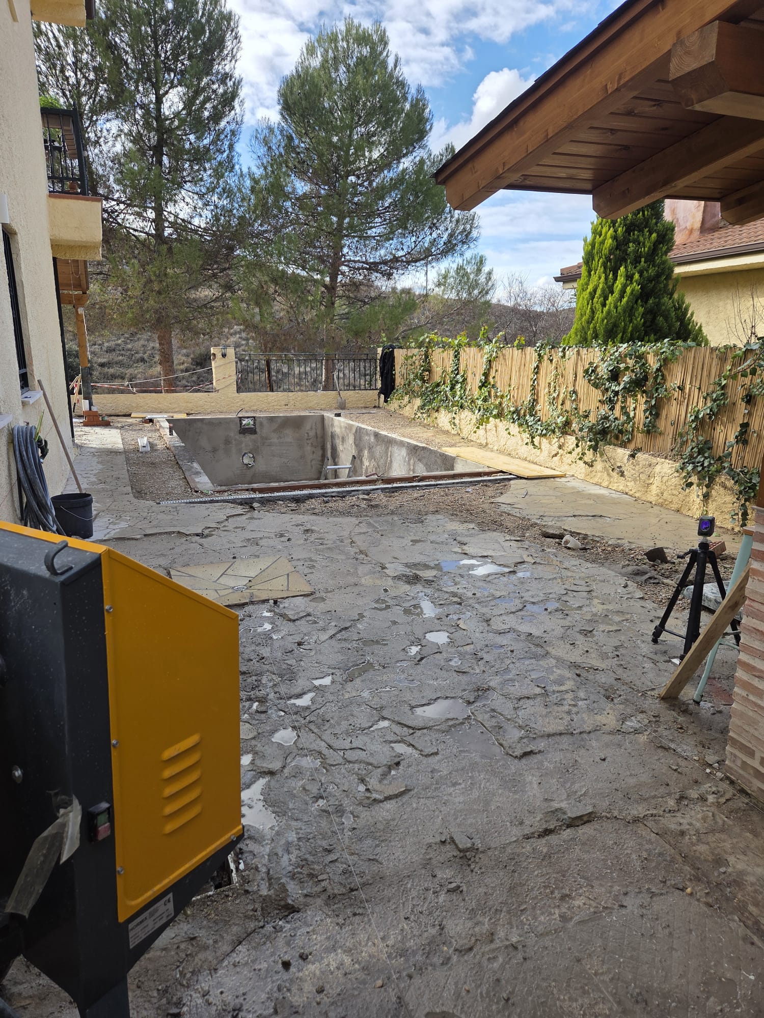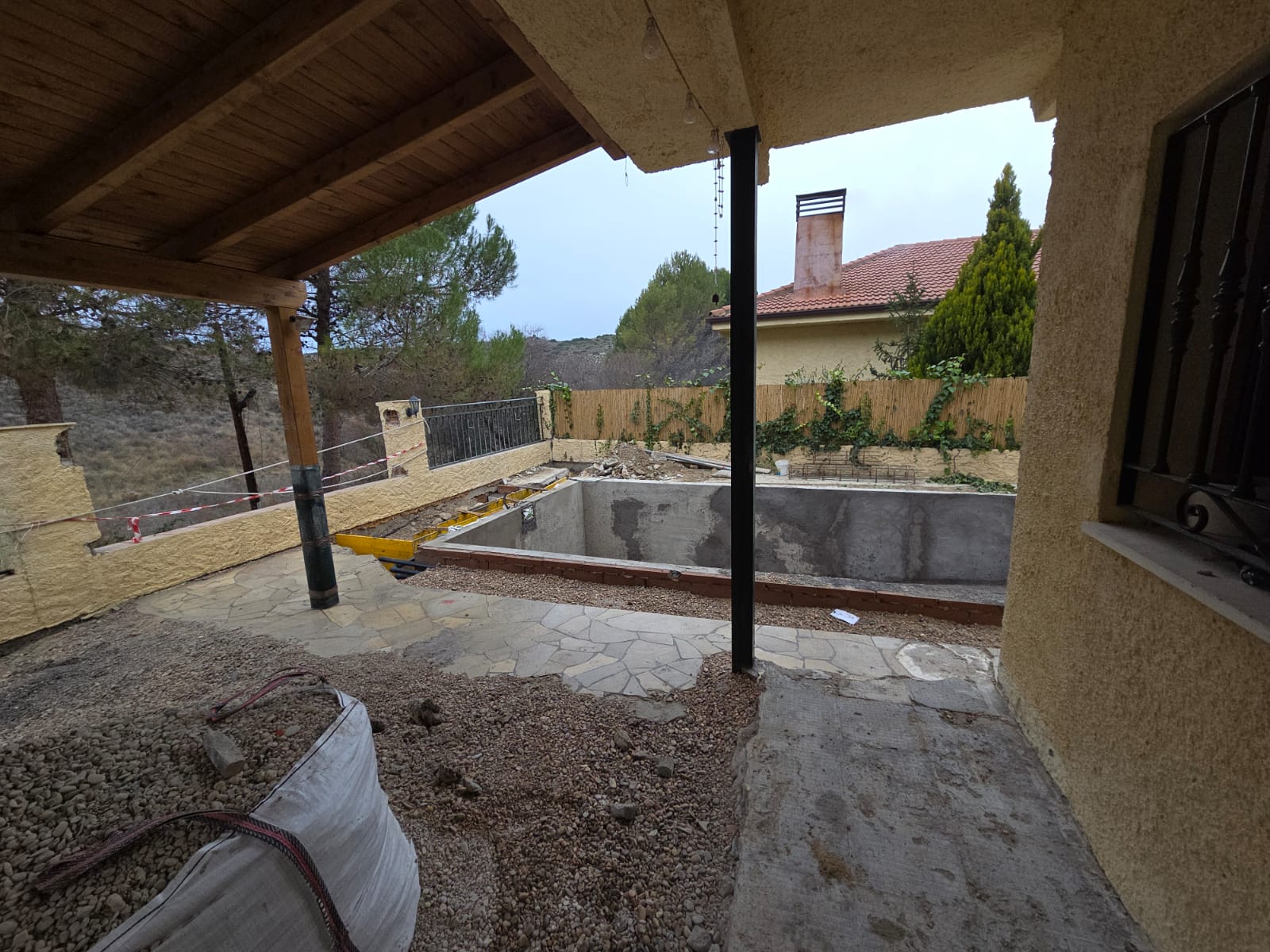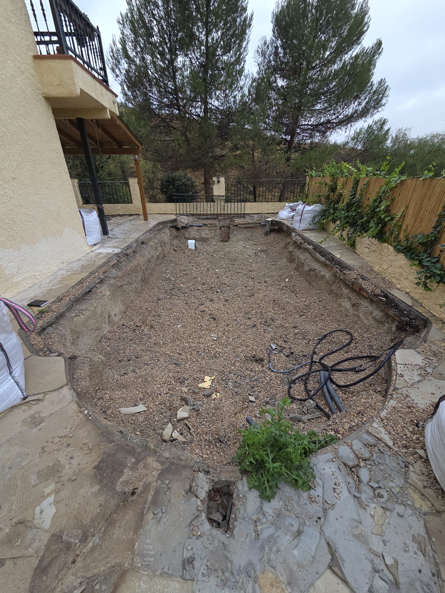 Renovación integral de piscina en chalet, transformando la antigua piscina de fibra afectada por terrenos arcillosos en un vaso de hormigón micropilotado, reforzado con pilotes de acero hincados a presión para máxima estabilidad y durabilidad.
