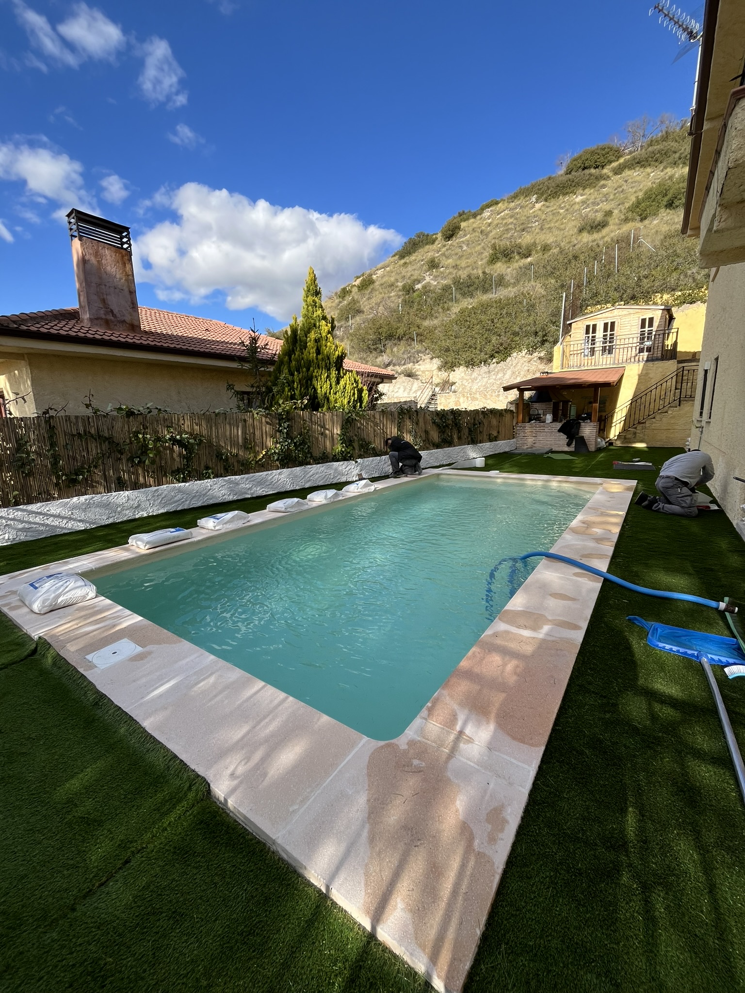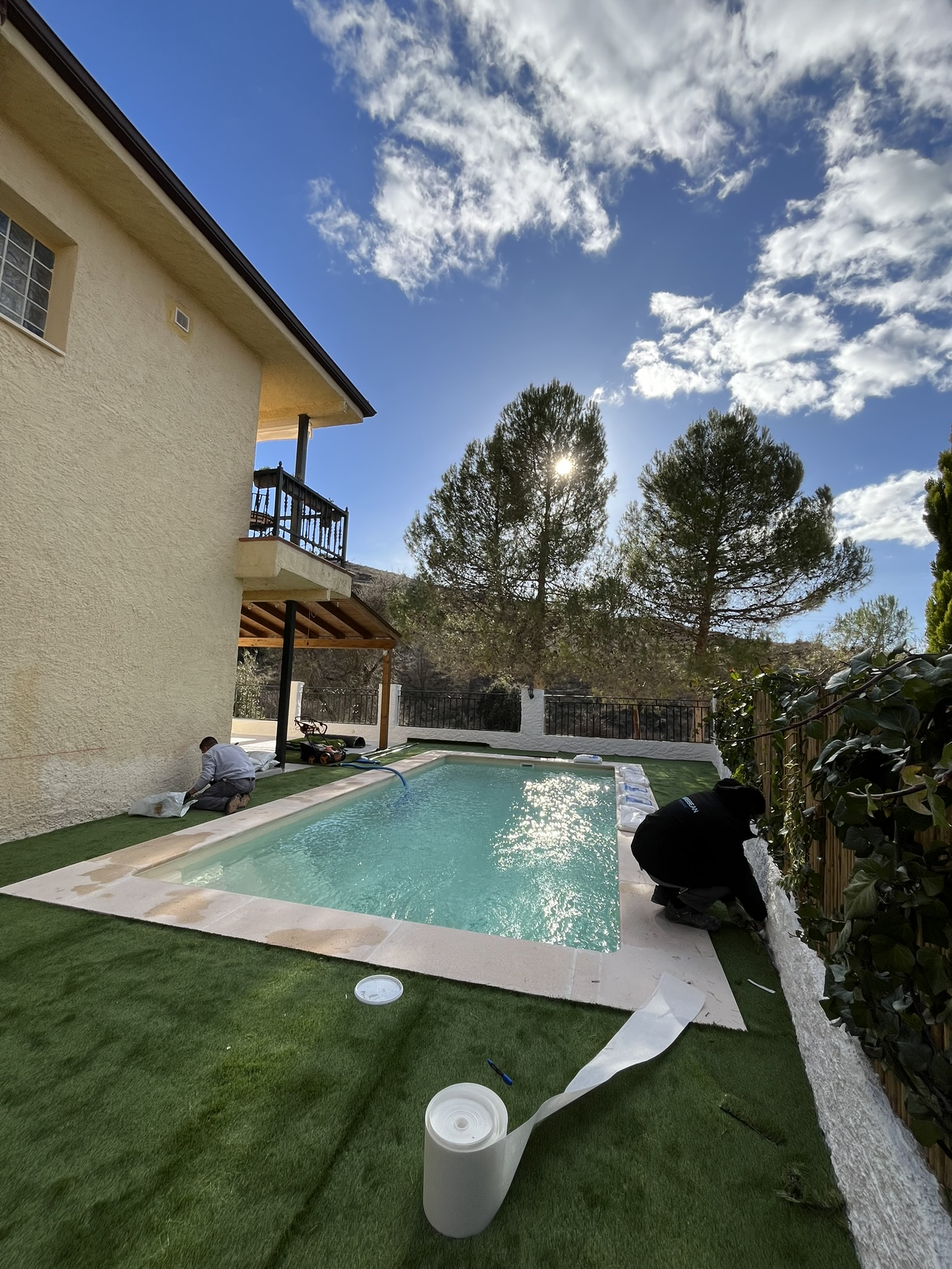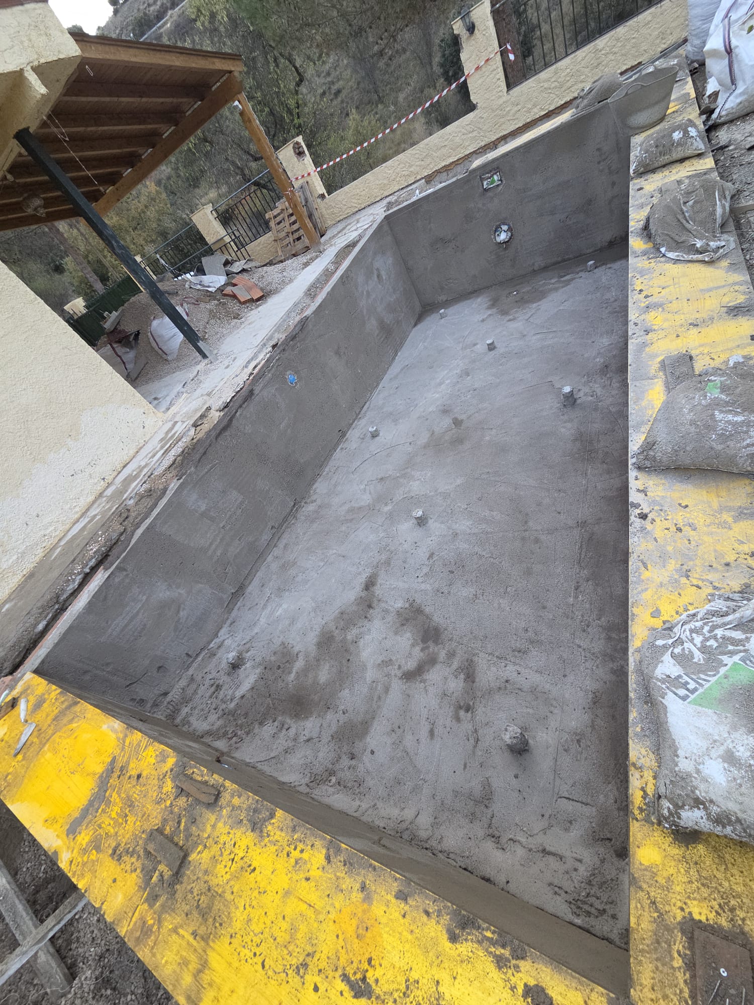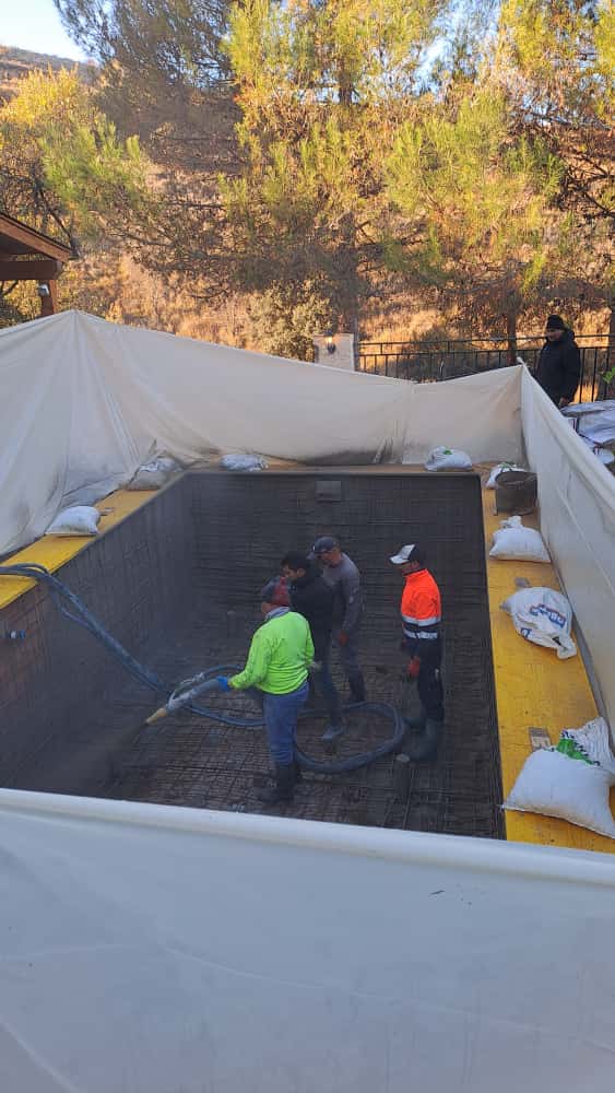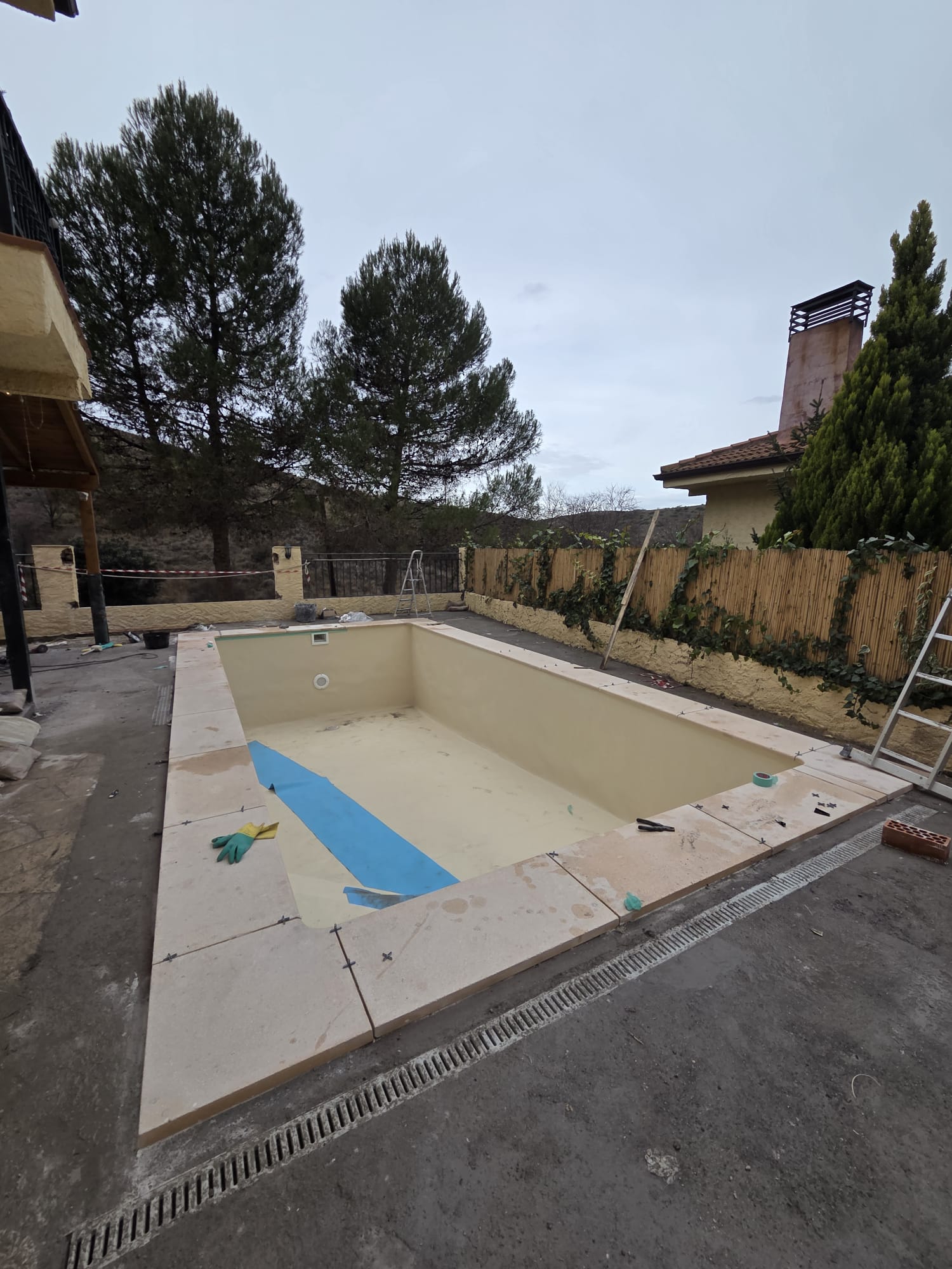 Renovación integral de piscina en chalet, transformando la antigua piscina de fibra afectada por terrenos arcillosos en un vaso de hormigón micropilotado, reforzado con pilotes de acero hincados a presión para máxima estabilidad y durabilidad.