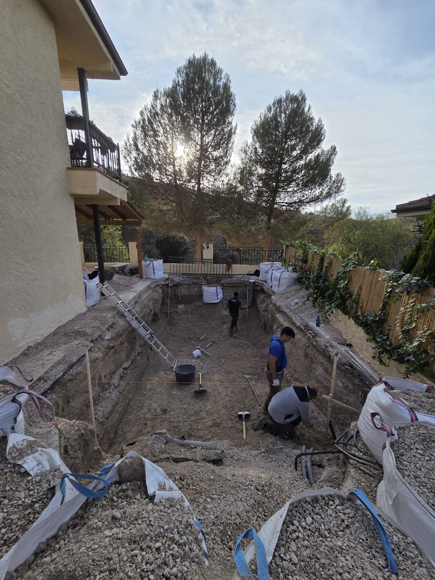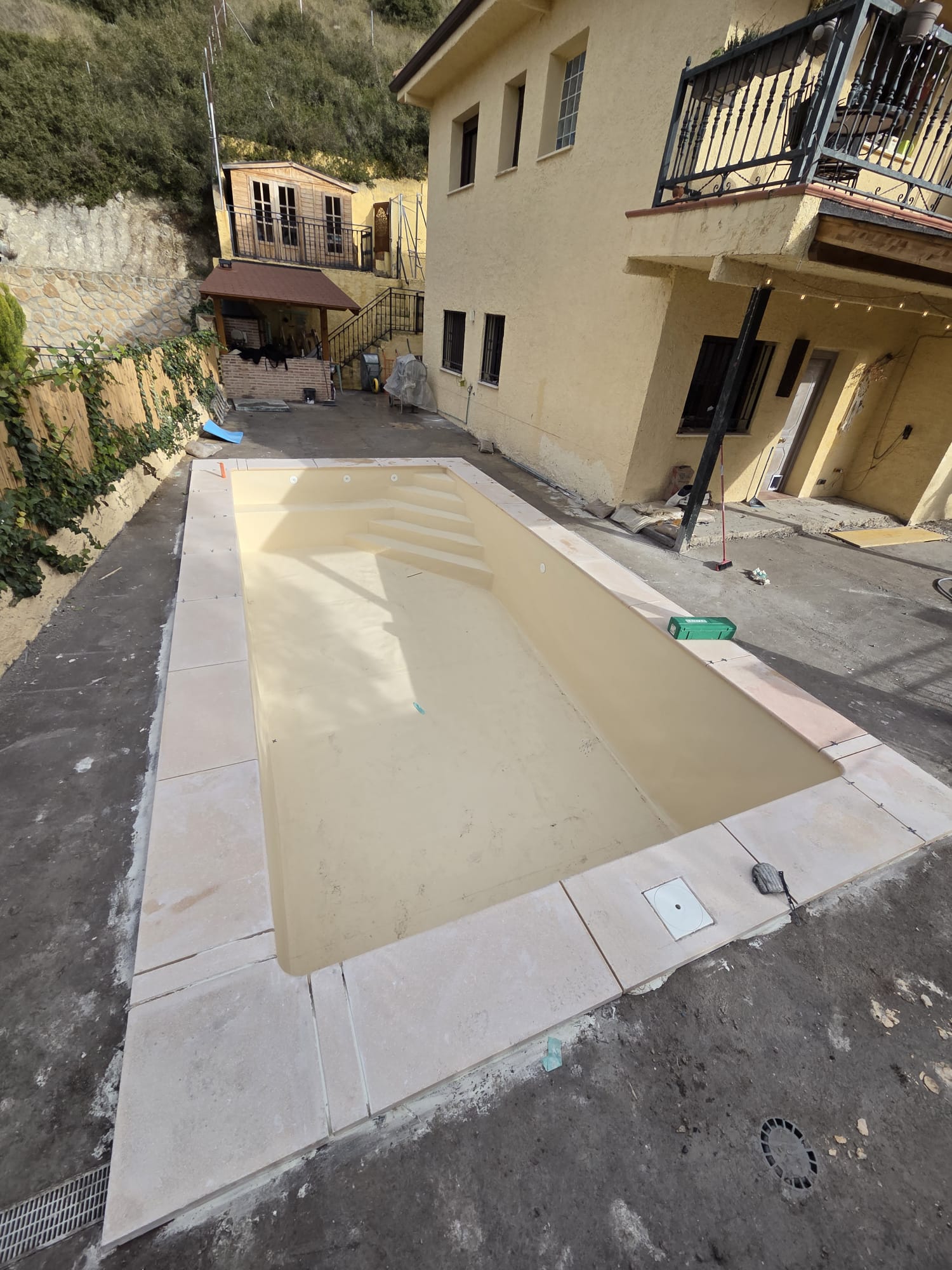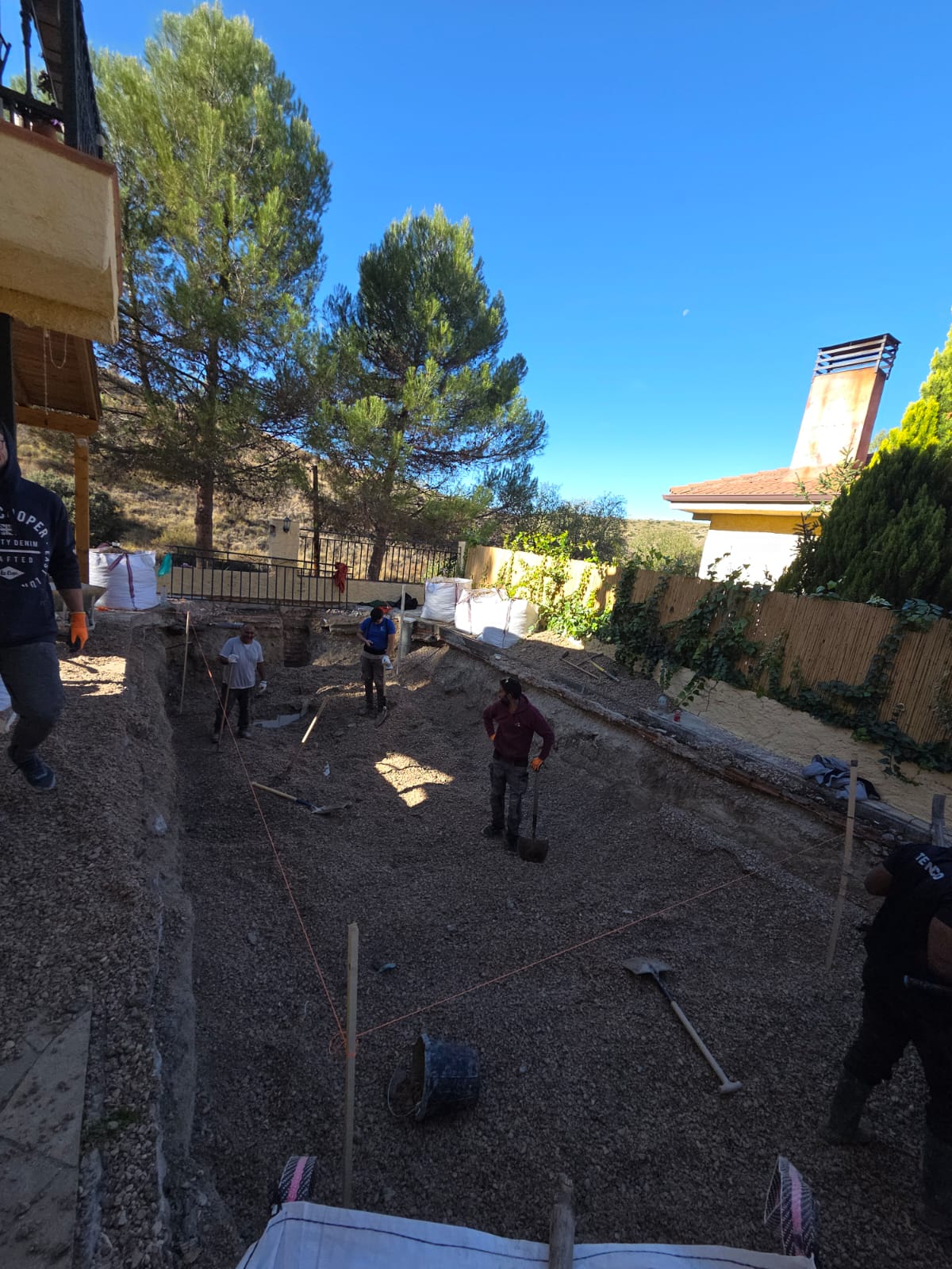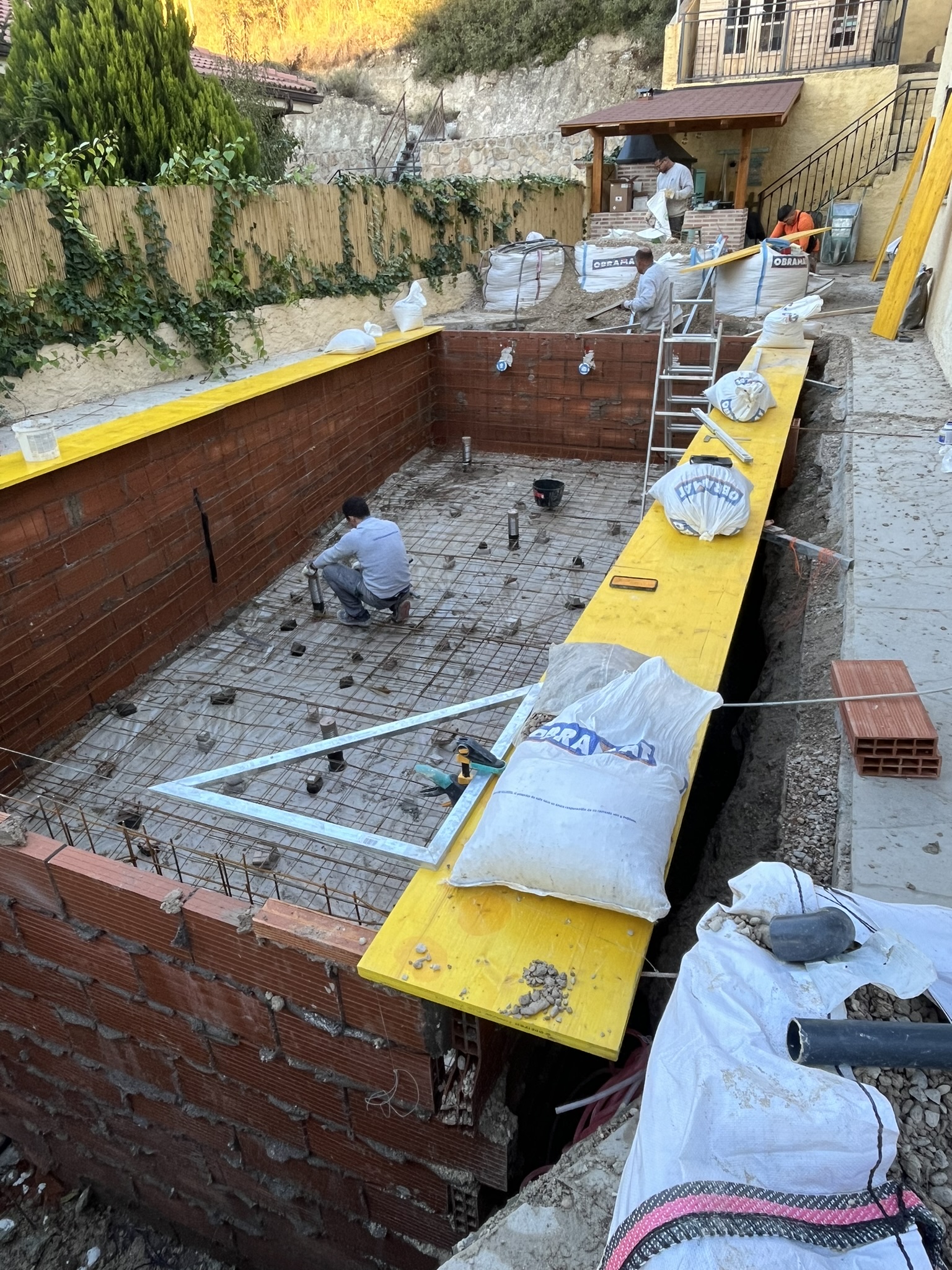 Renovación integral de piscina en chalet, transformando la antigua piscina de fibra afectada por terrenos arcillosos en un vaso de hormigón micropilotado, reforzado con pilotes de acero hincados a presión para máxima estabilidad y durabilidad.
