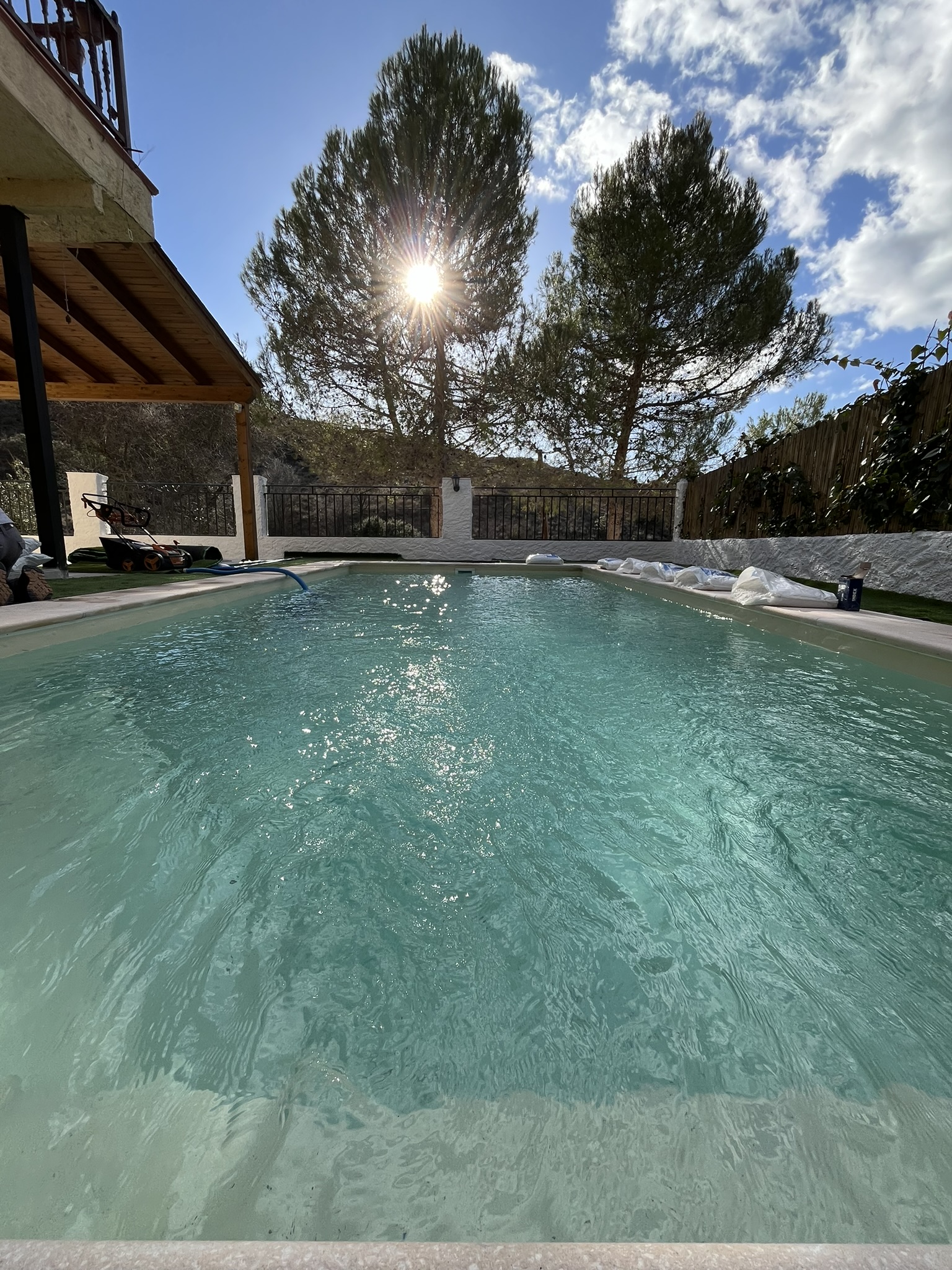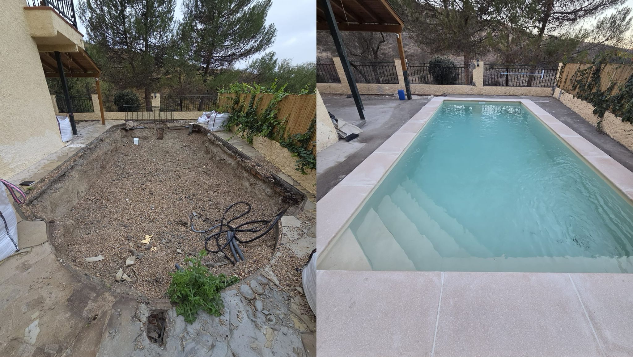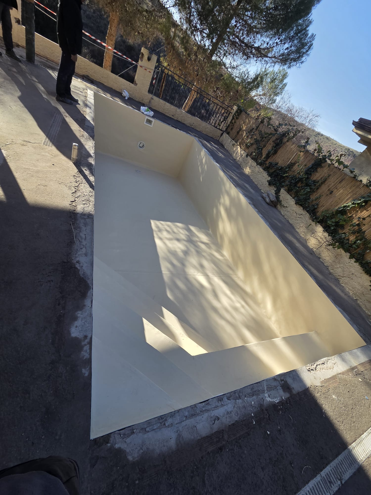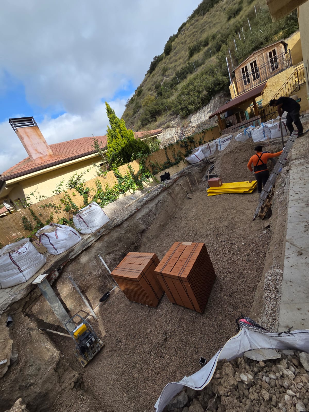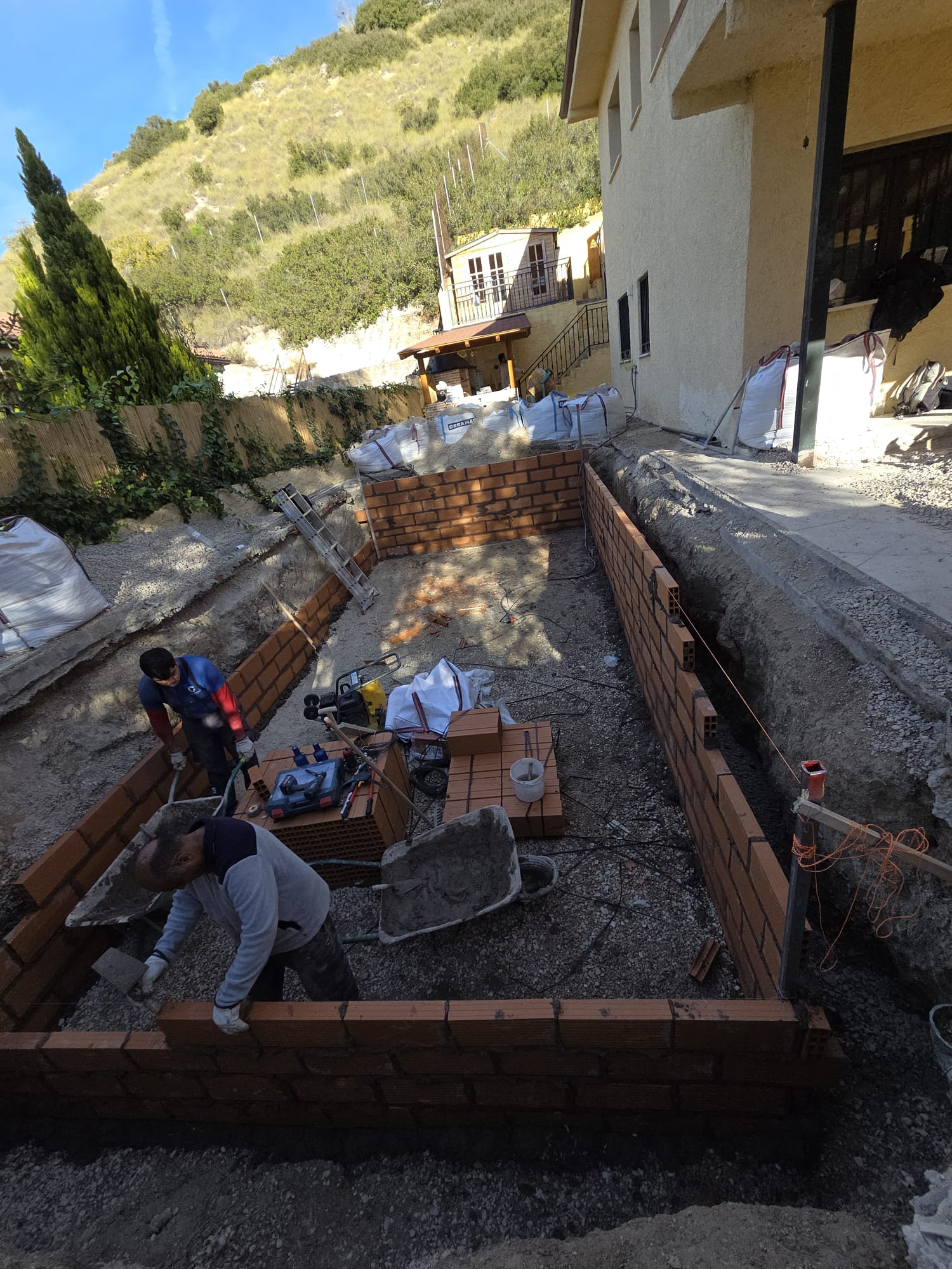 Renovación integral de piscina en chalet, transformando la antigua piscina de fibra afectada por terrenos arcillosos en un vaso de hormigón micropilotado, reforzado con pilotes de acero hincados a presión para máxima estabilidad y durabilidad.
