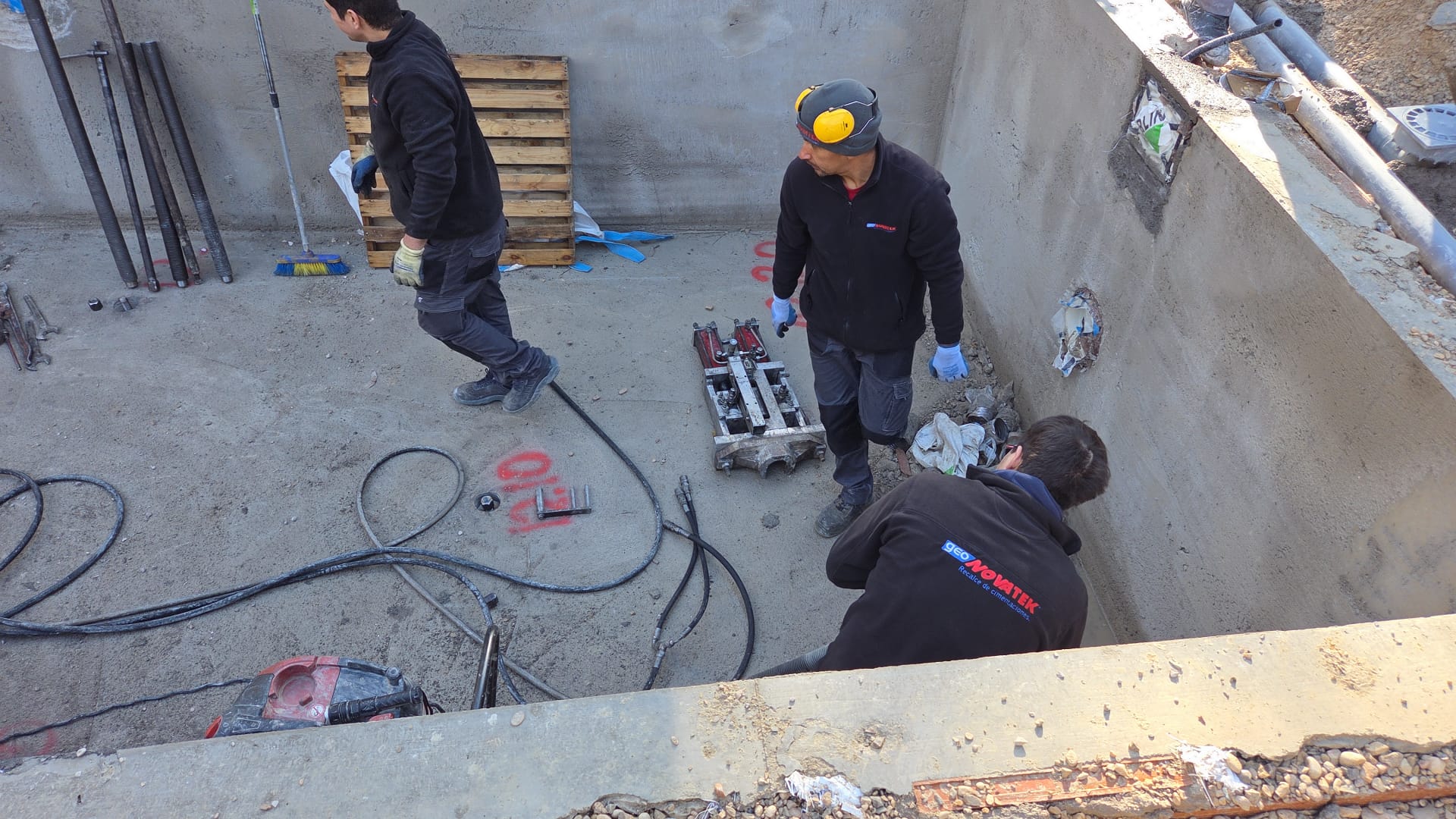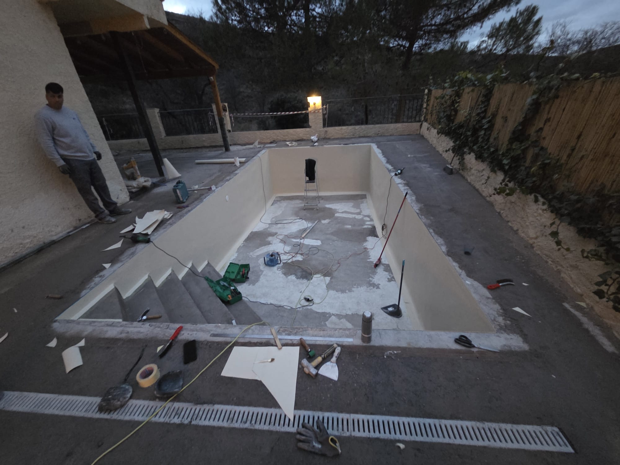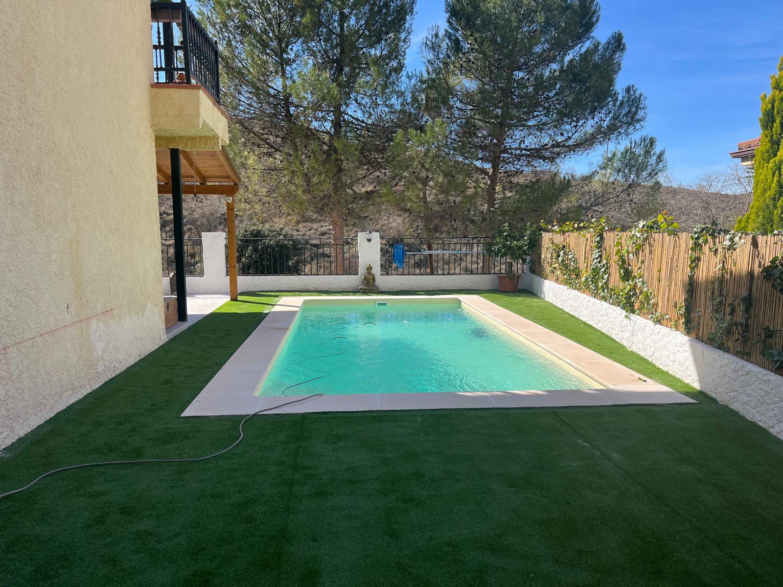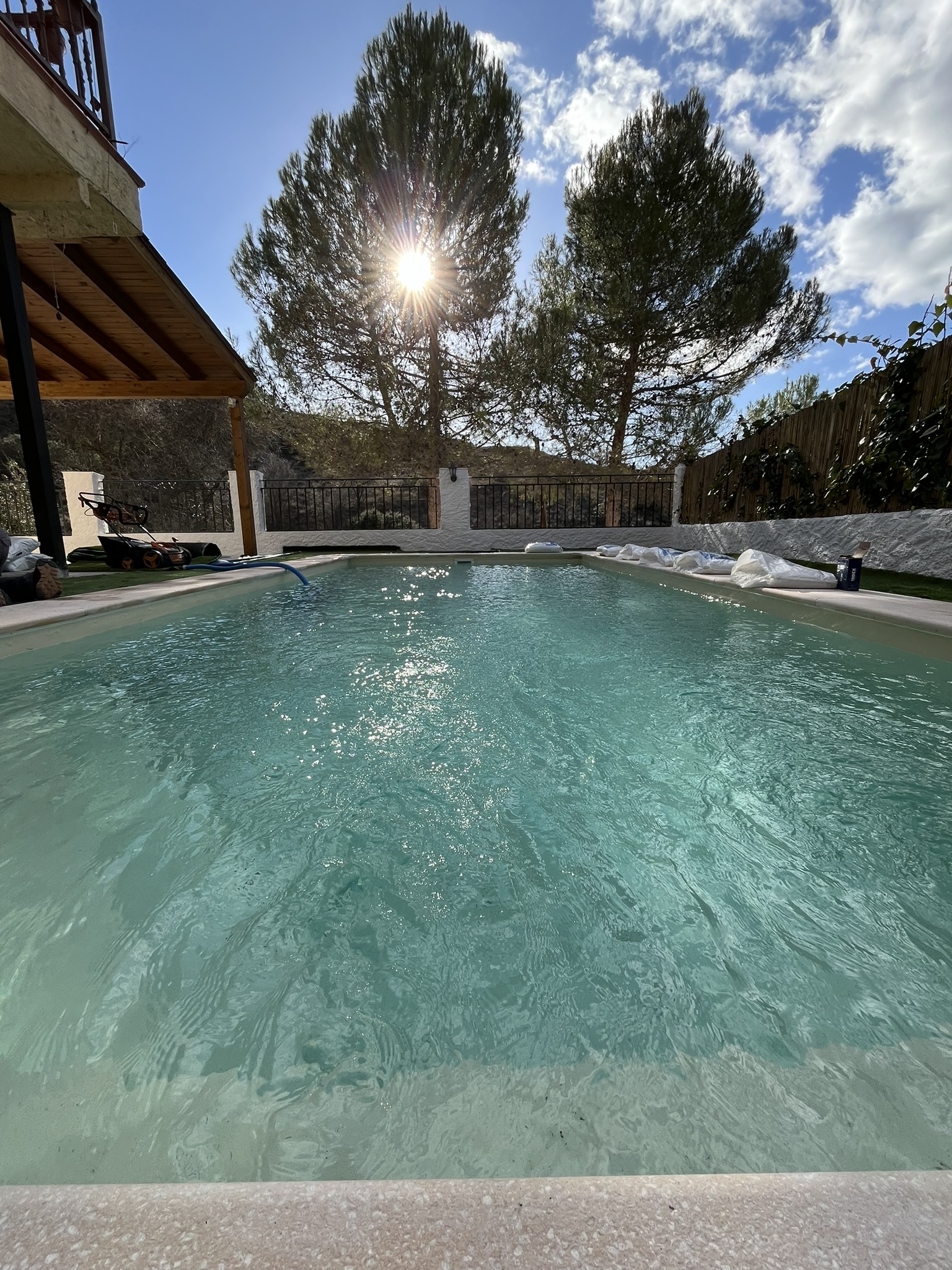 Renovación integral de piscina en chalet, transformando la antigua piscina de fibra afectada por terrenos arcillosos en un vaso de hormigón micropilotado, reforzado con pilotes de acero hincados a presión para máxima estabilidad y durabilidad.