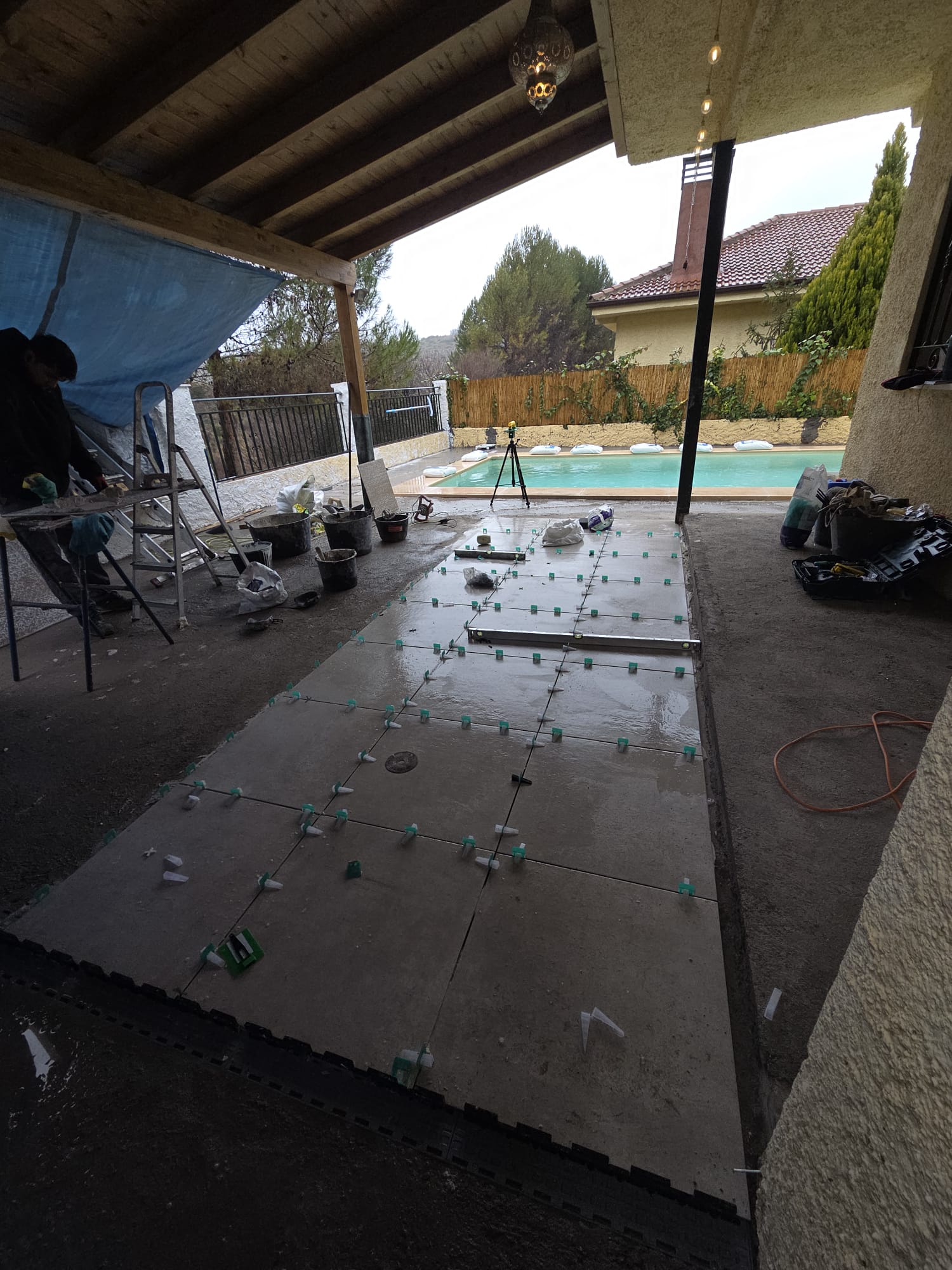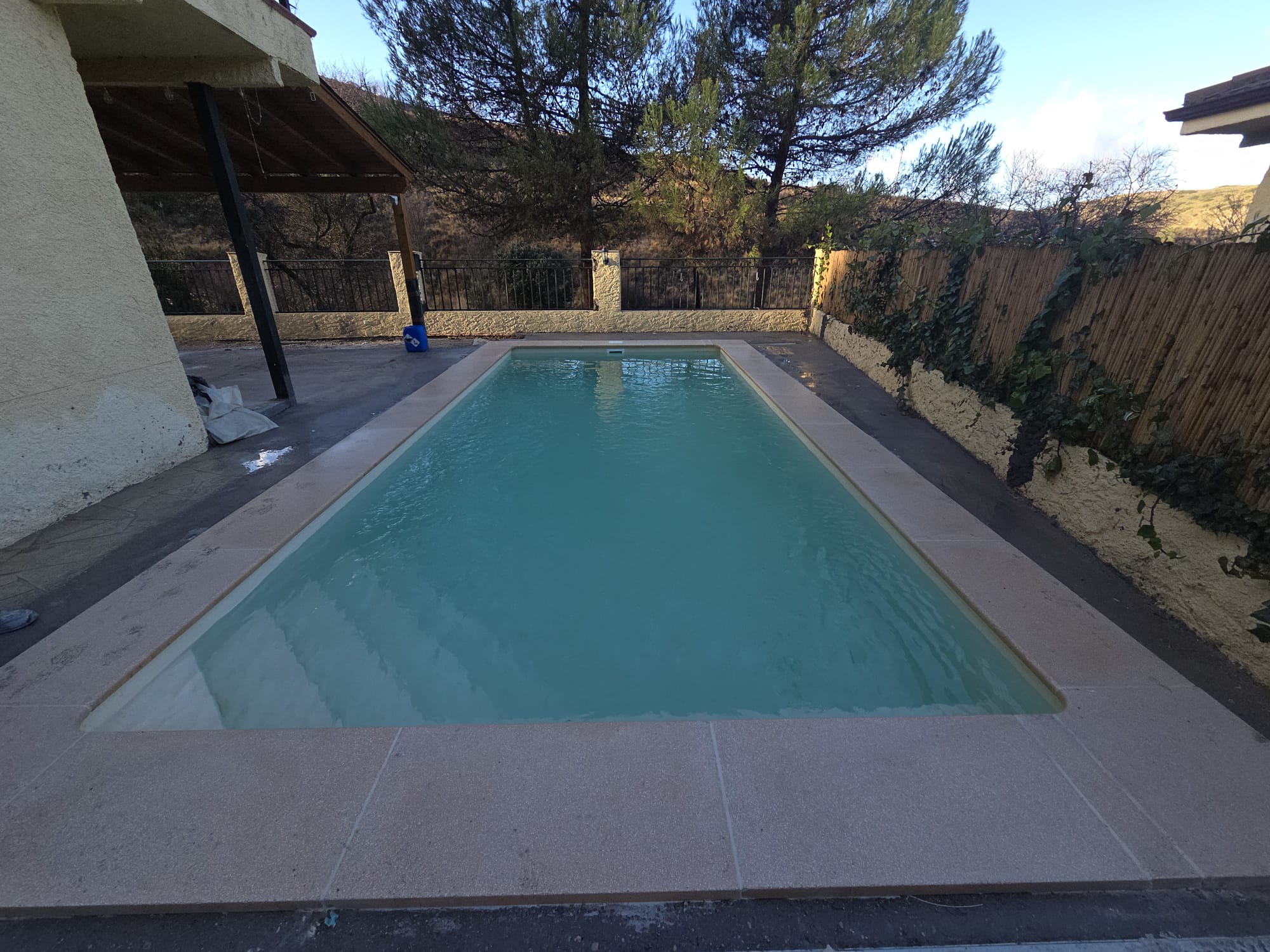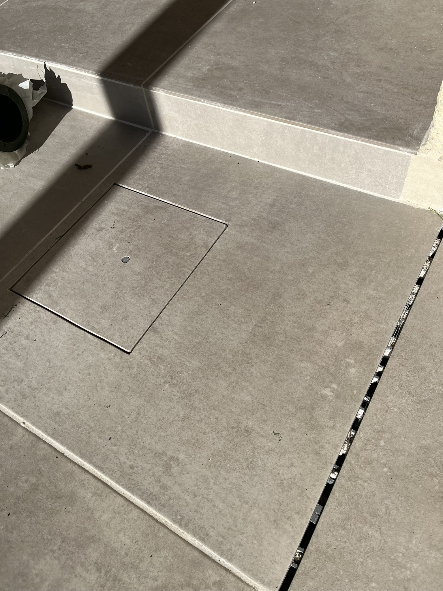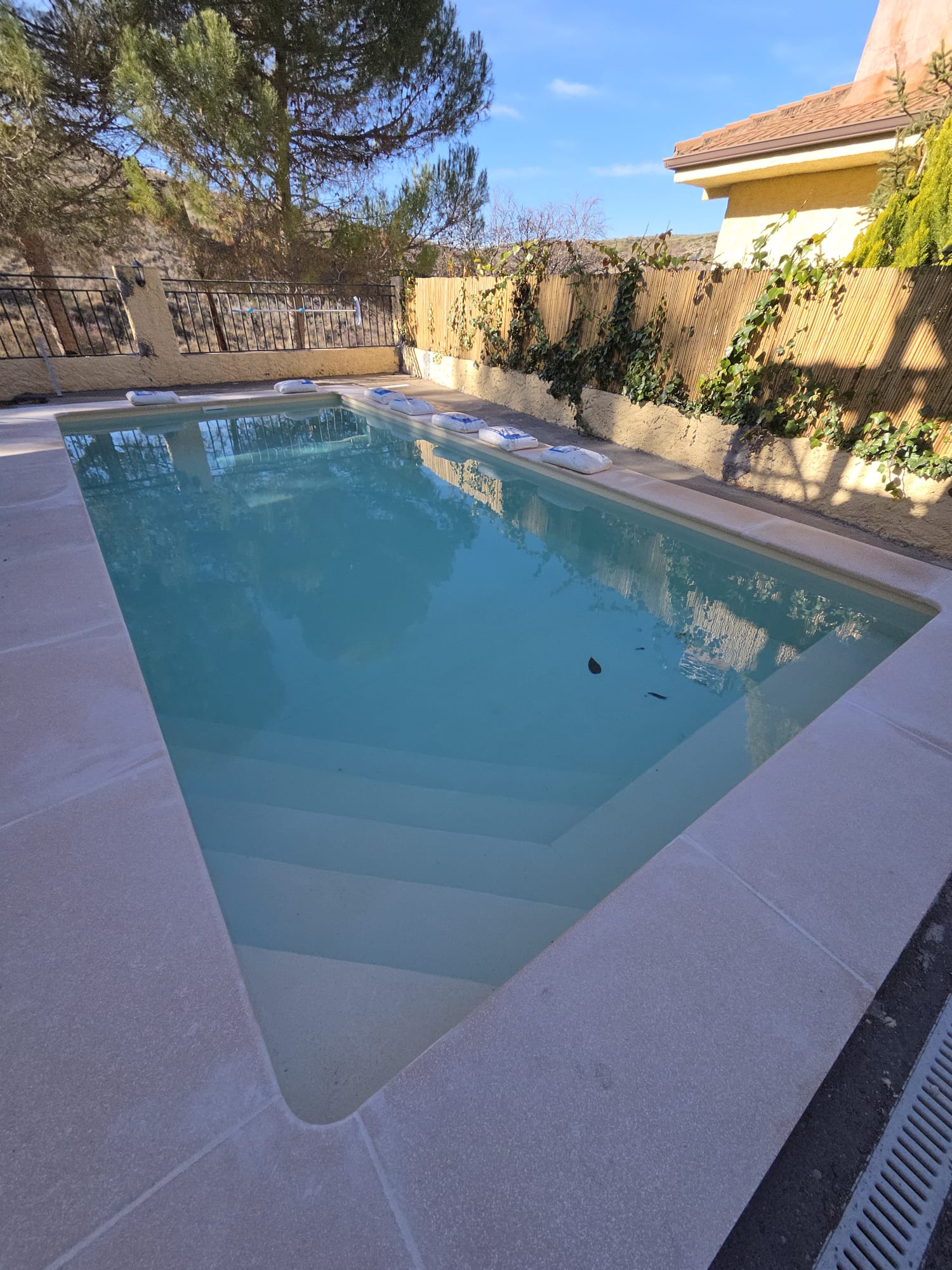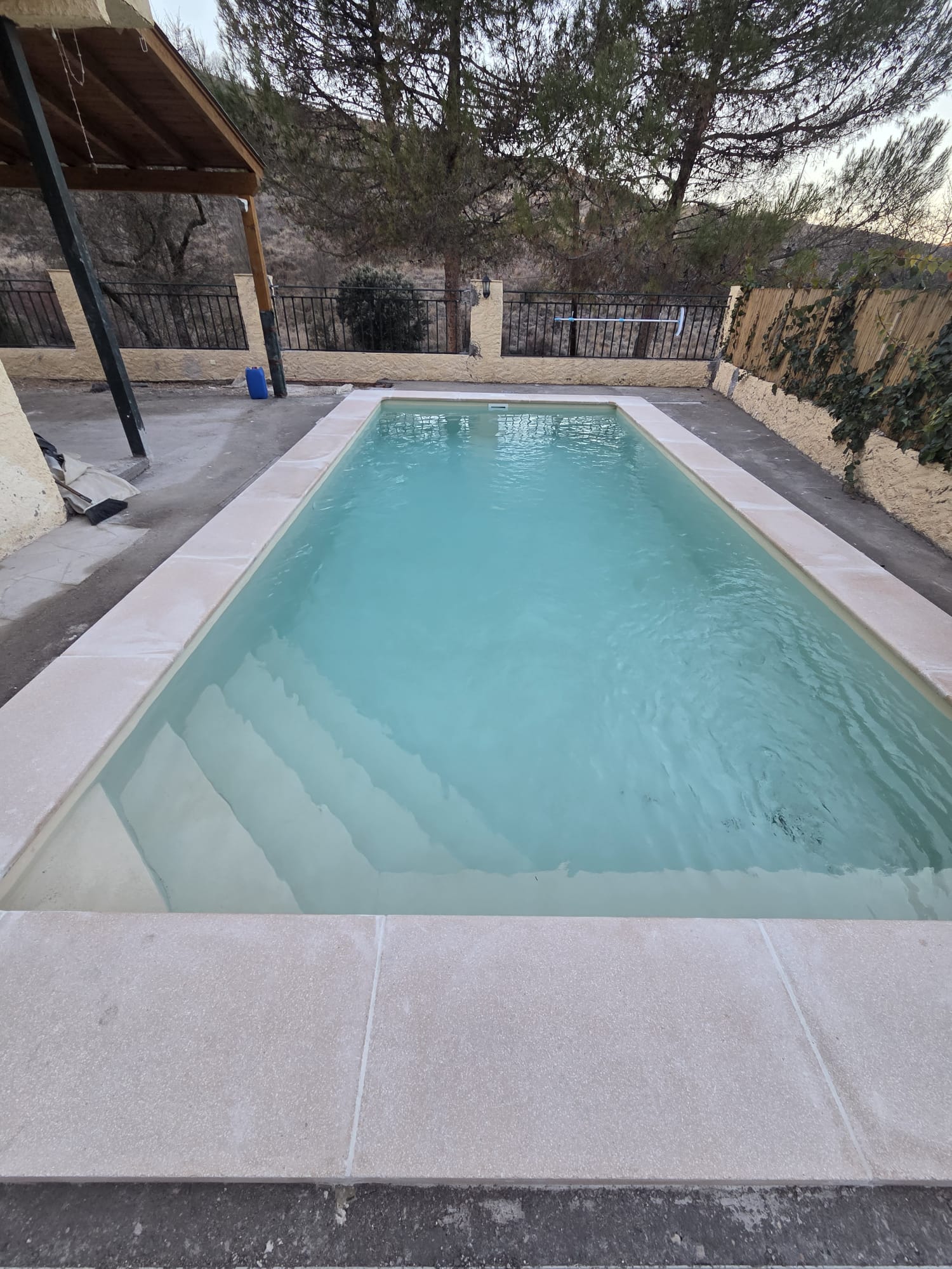 Se construyó escalera de obra con banco corrido y se revestió con lámina armada CEFIL POOL, gama PASSION, modelo SABLE, coronada en porcelánico. Se instaló drenaje al terreno mediante canaletas, incluyendo canaleta oculta en la zona de porcelánico, garantizando perfecto desagüe y mantenimiento.
