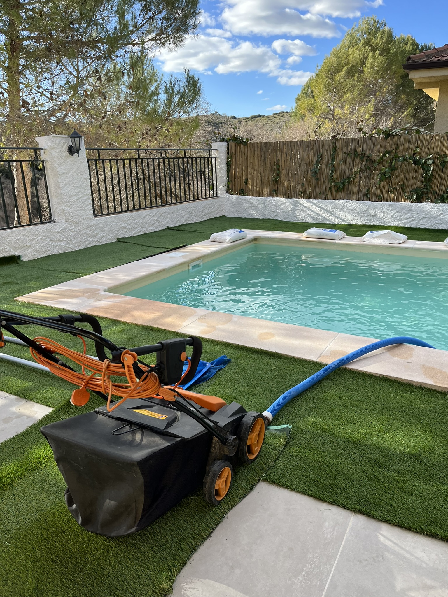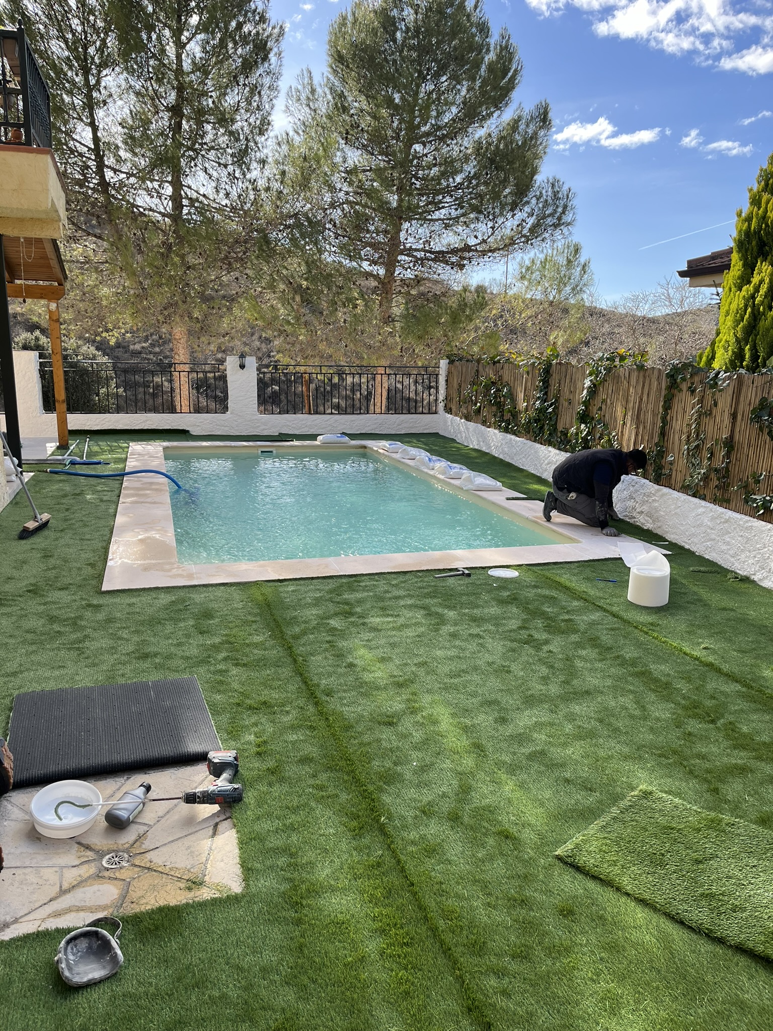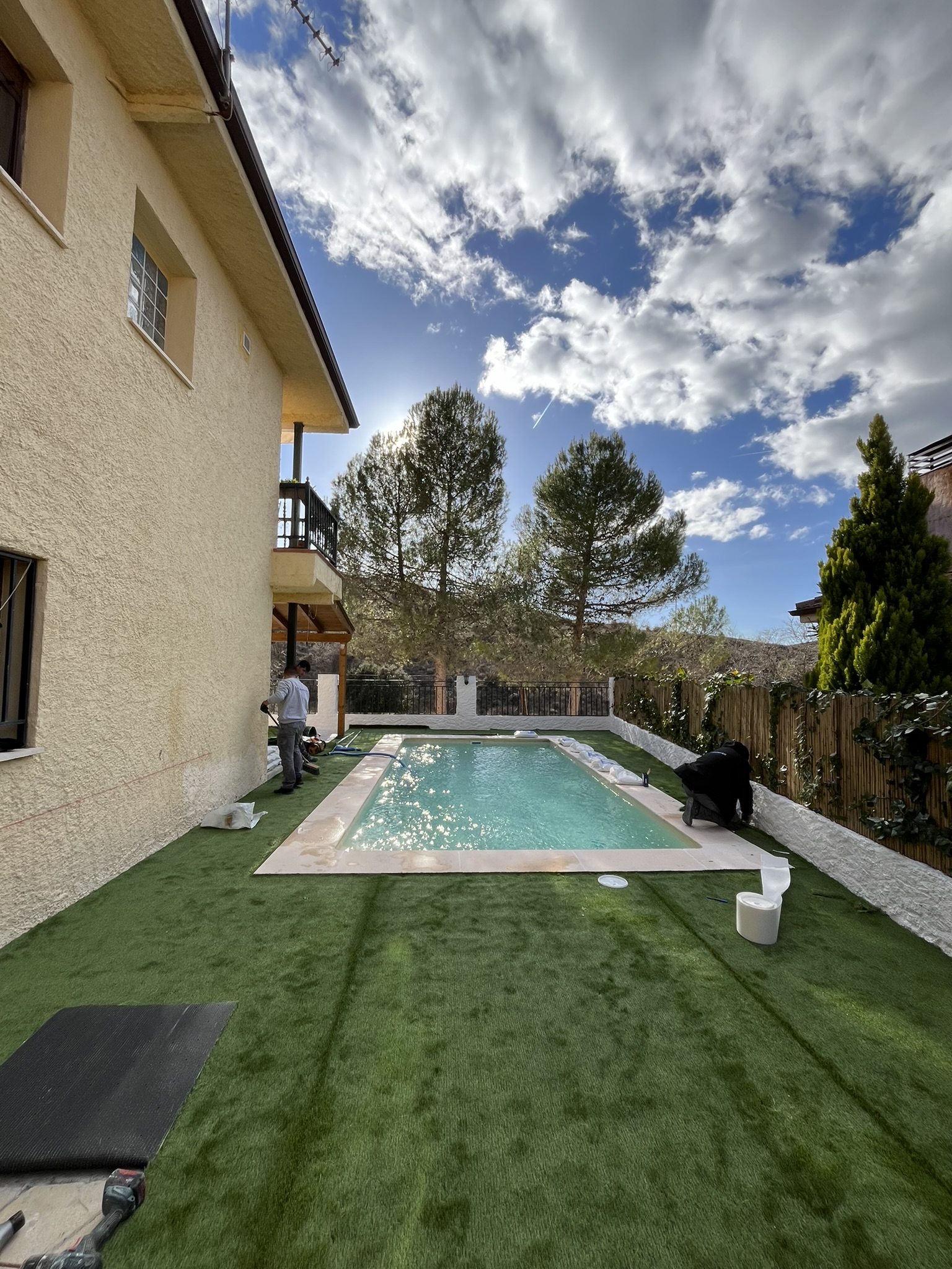El entorno se completó con solado en porcelánico y césped artificial, creando un espacio elegante y confortable, ideal para relajarse tras un chapuzón.