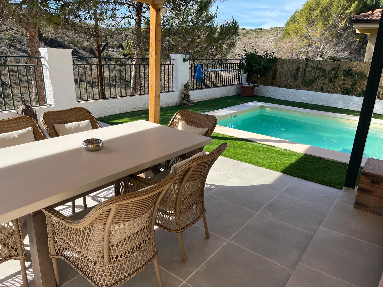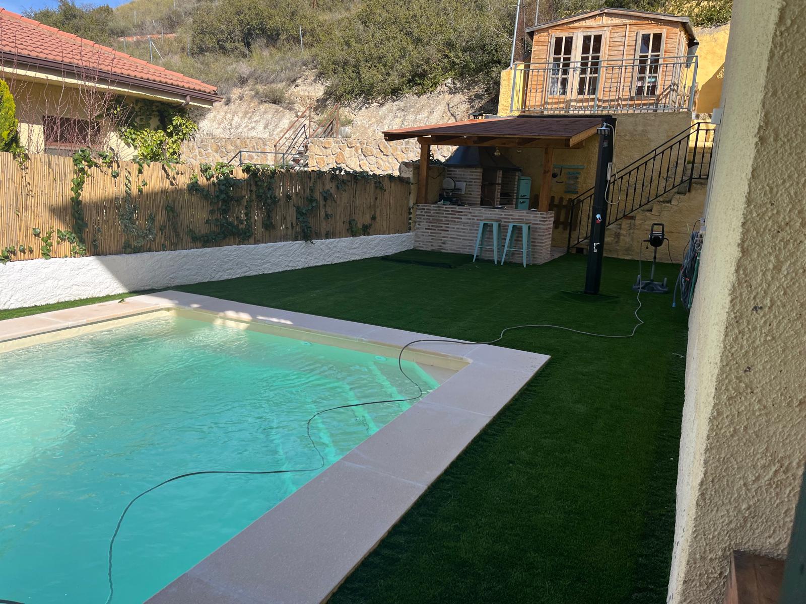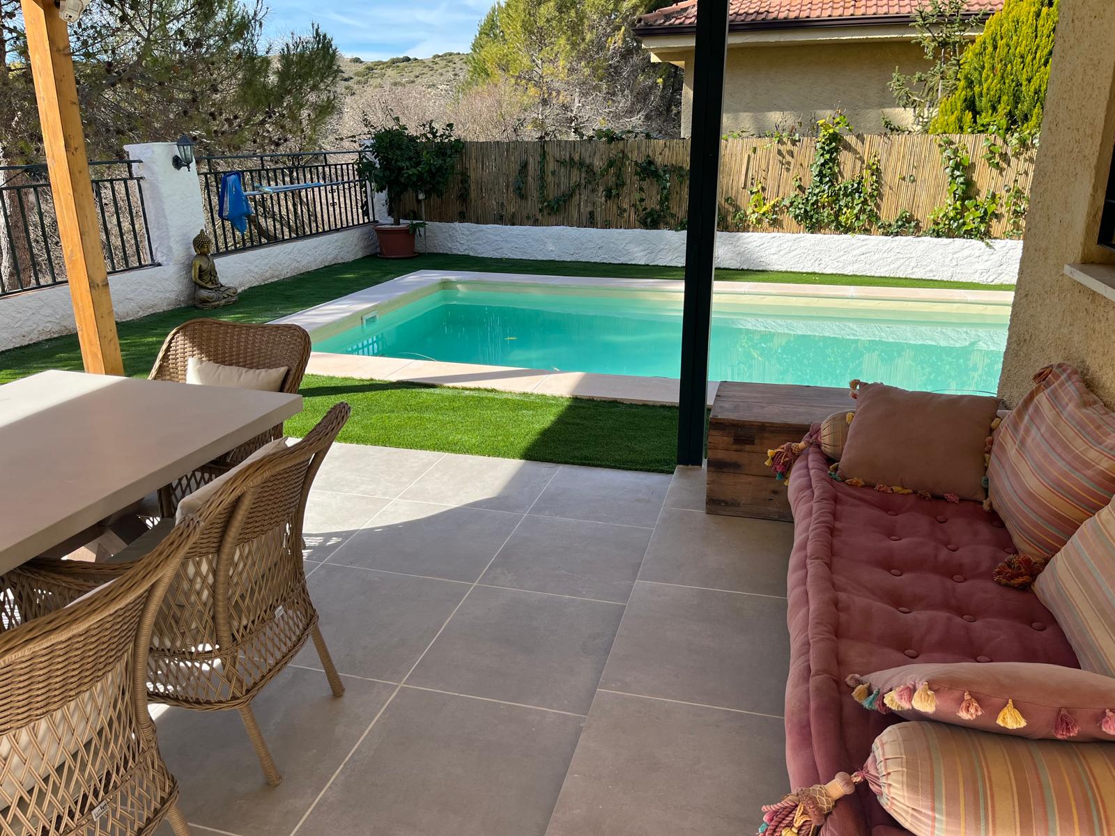 El entorno se completó con solado en porcelánico y césped artificial, creando un espacio elegante y confortable, ideal para relajarse tras un chapuzón.