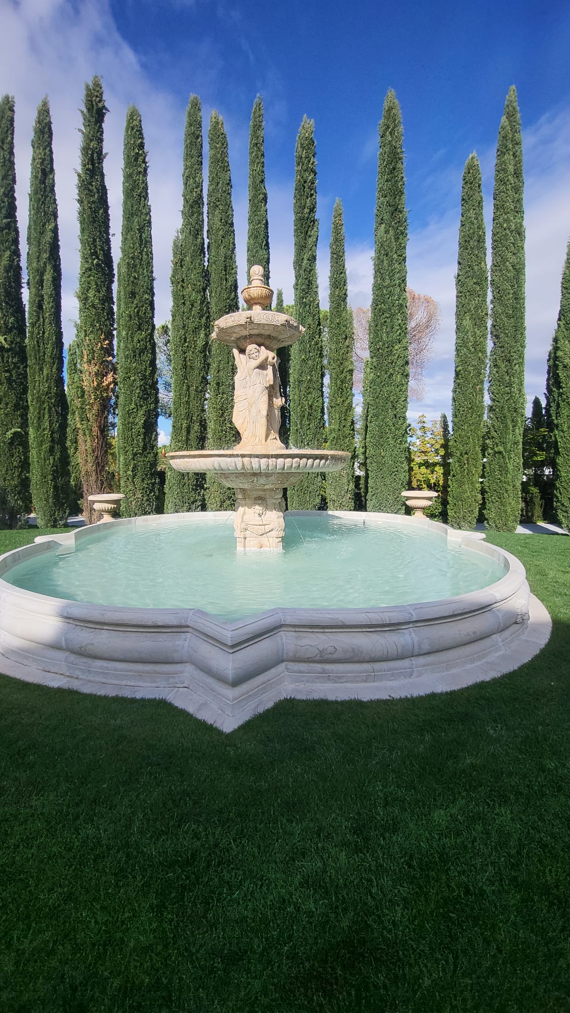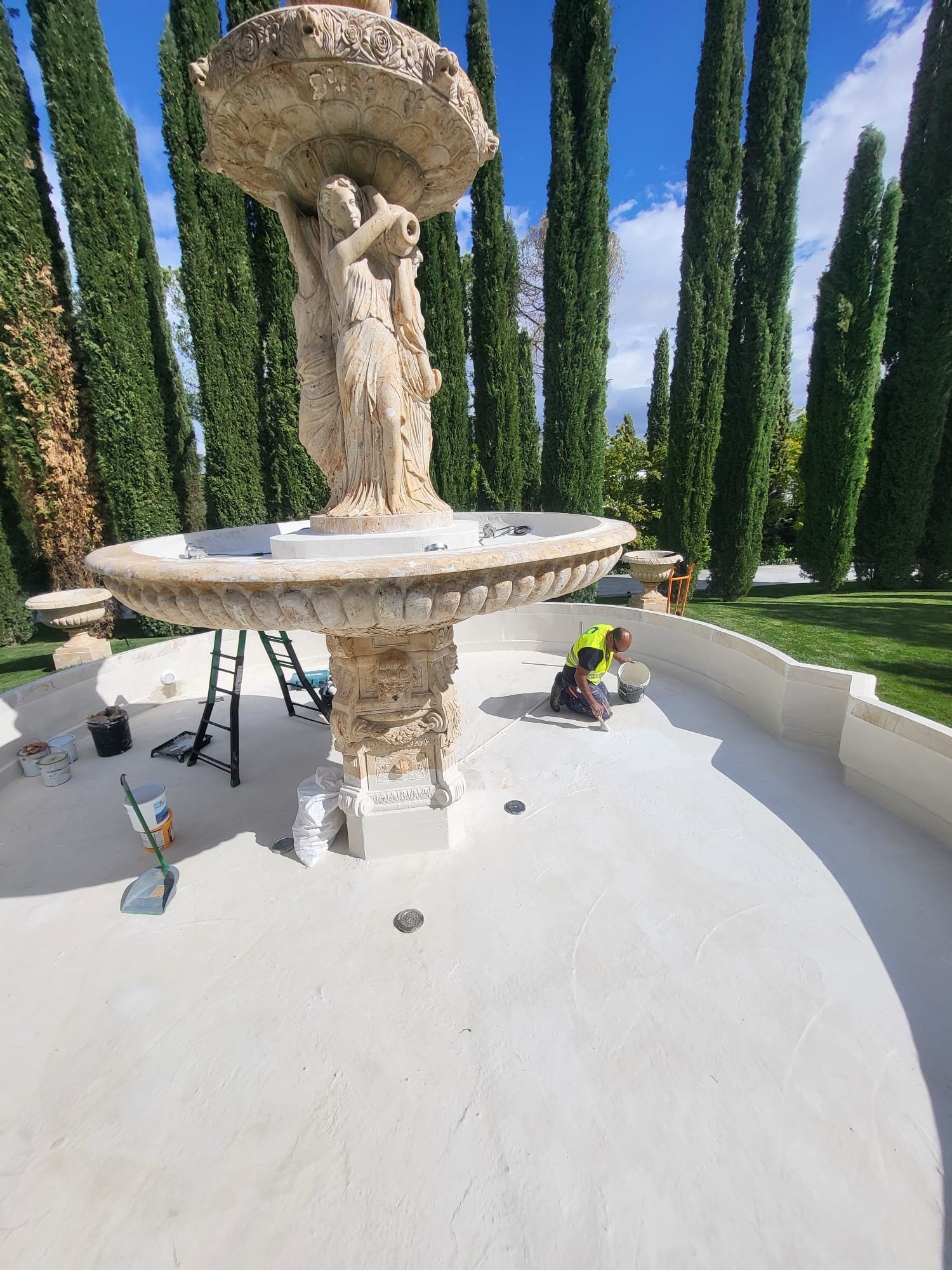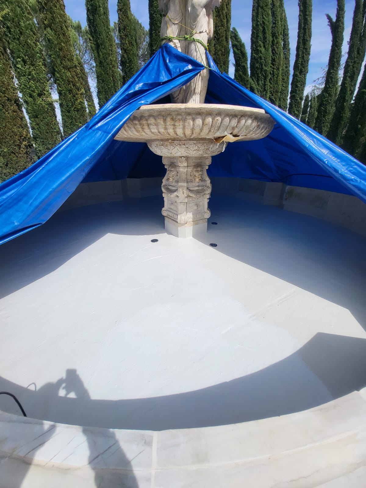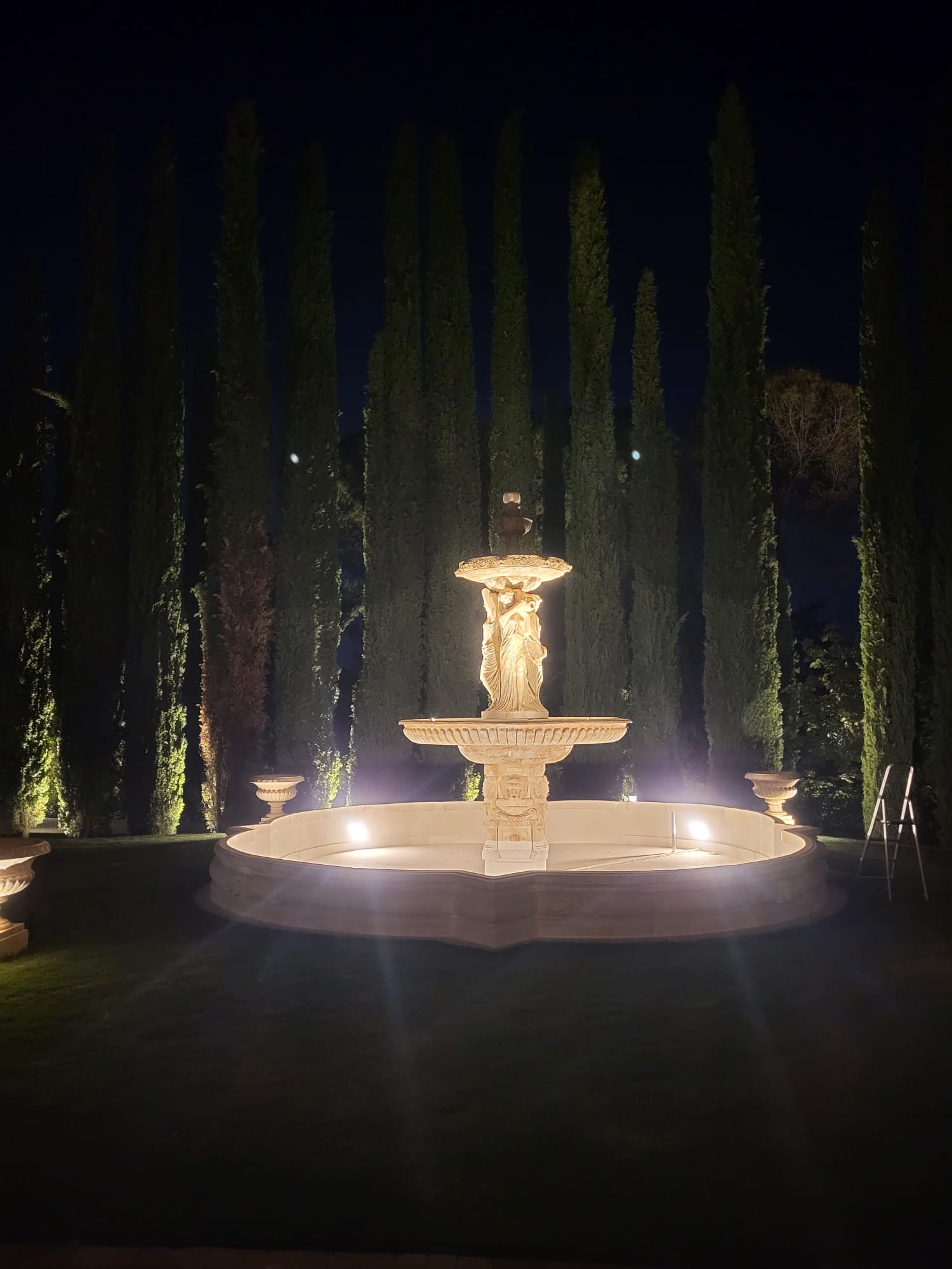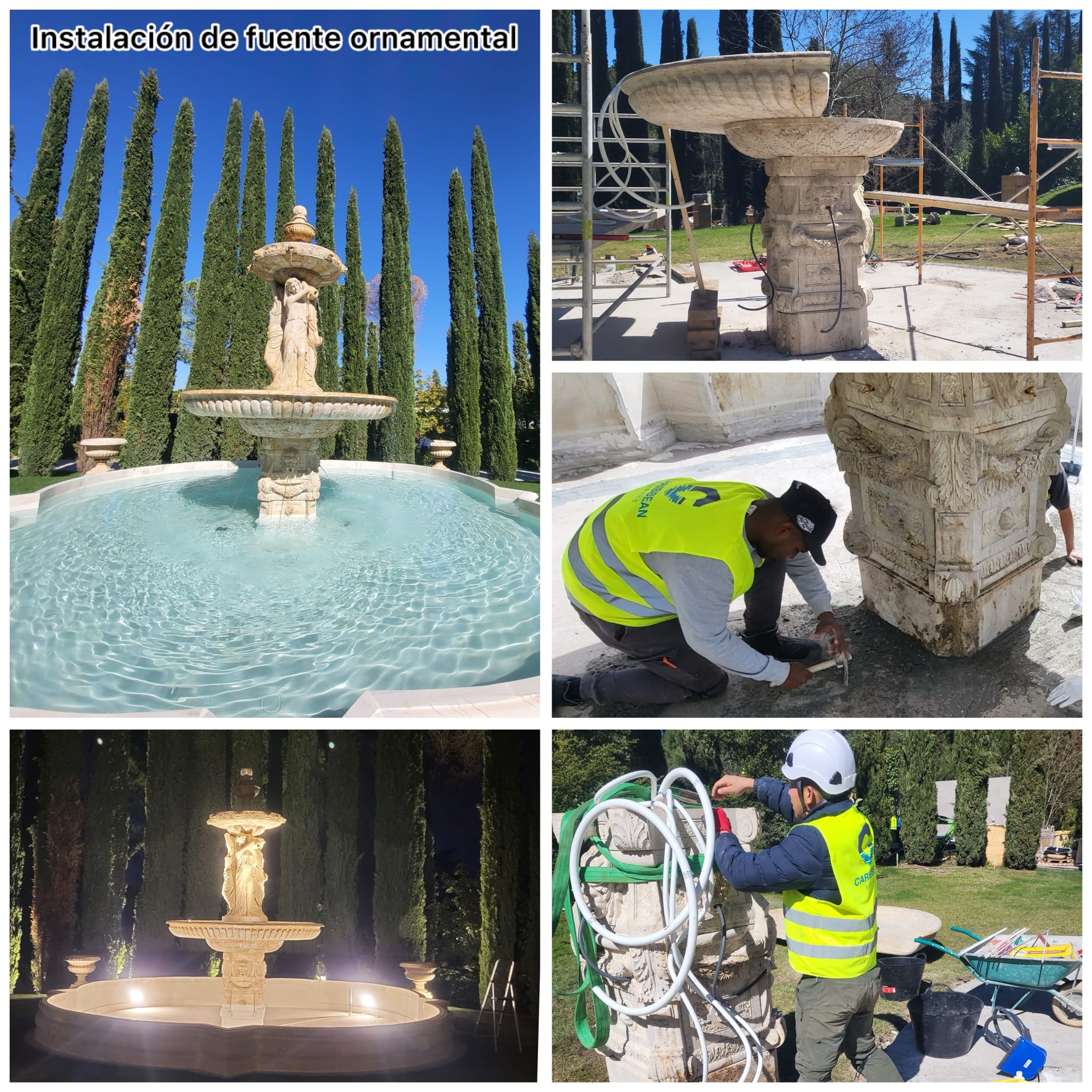 Se llevó a cabo la impermeabilización del vaso de la fuente, la instalación de iluminación subacuática en blanco cálido, aportando elegancia y ambiente, y la colocación de fuentes accesorias que completan y realzan el conjunto del recinto.