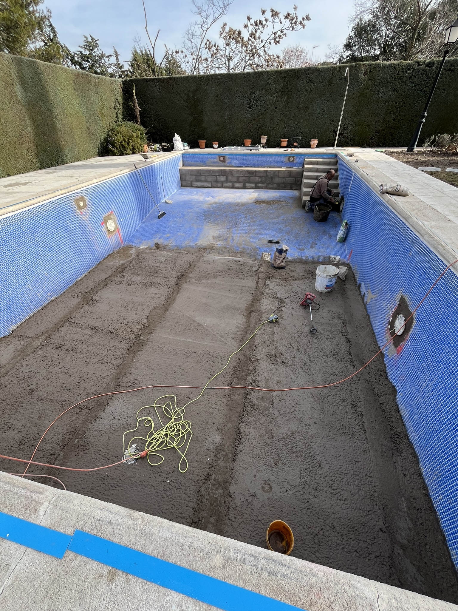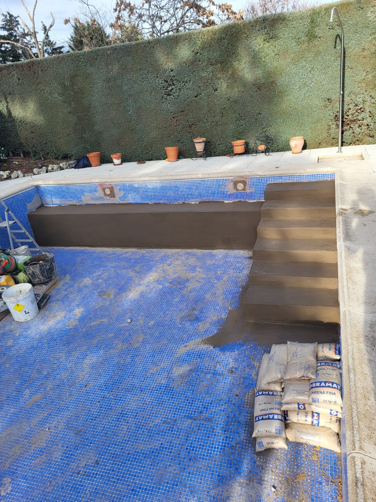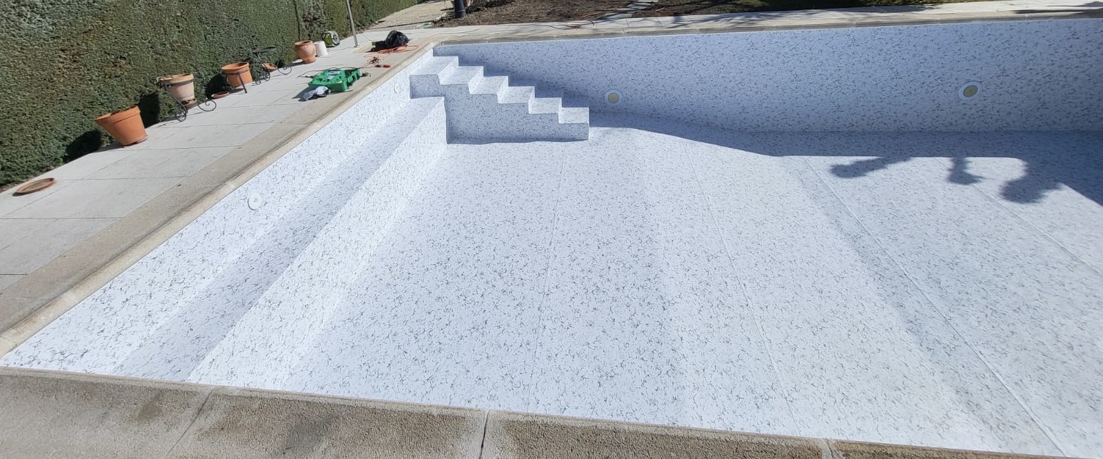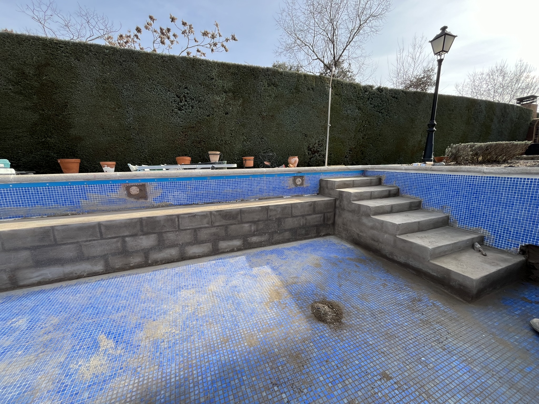 Renovación integral de piscina privada, con reducción de la profundidad del fondo para mayor confort y seguridad, y construcción de escalera de obra con banco corrido.