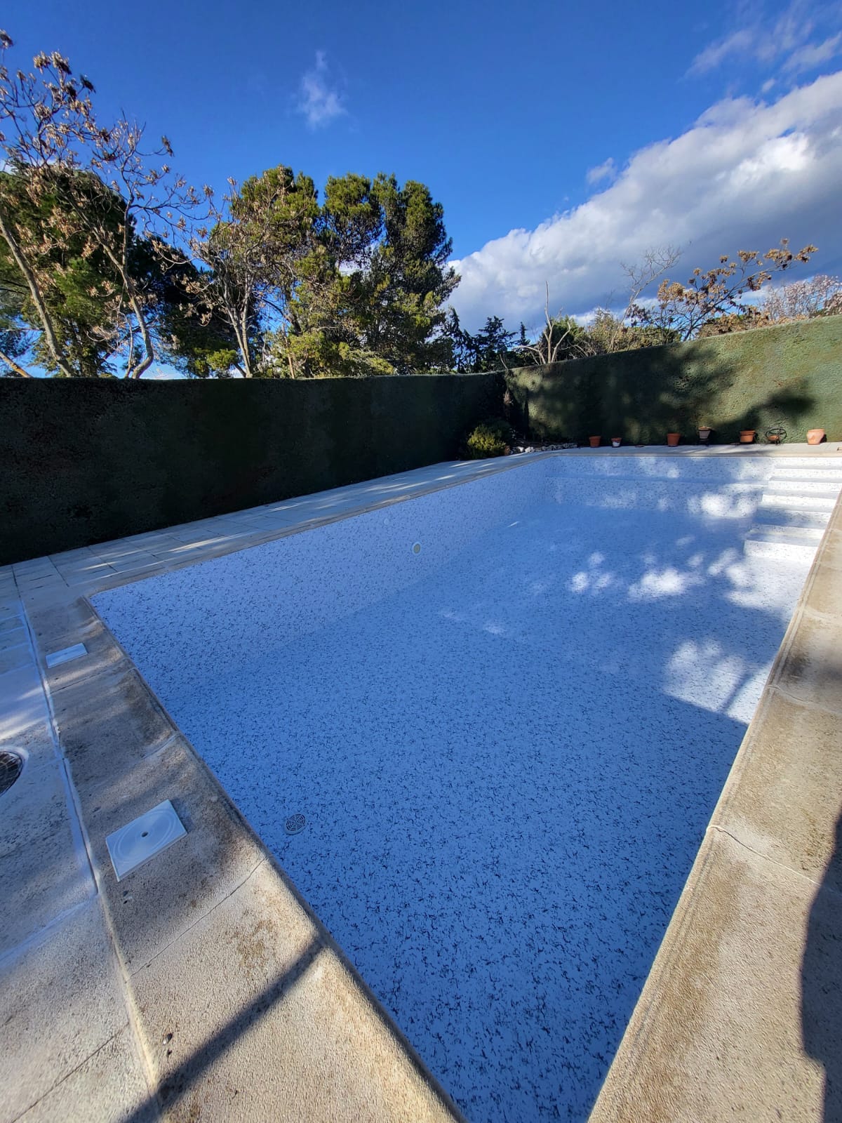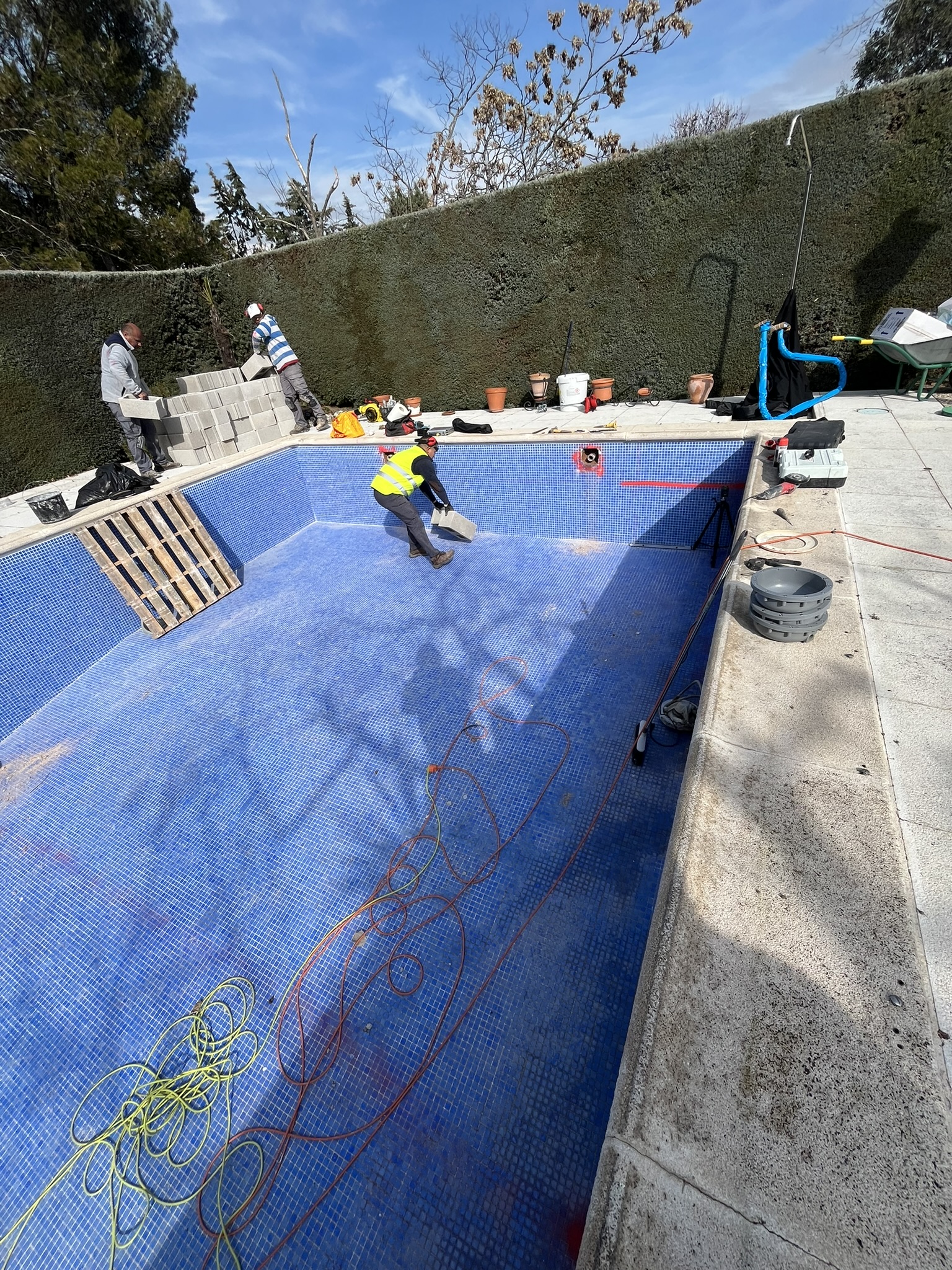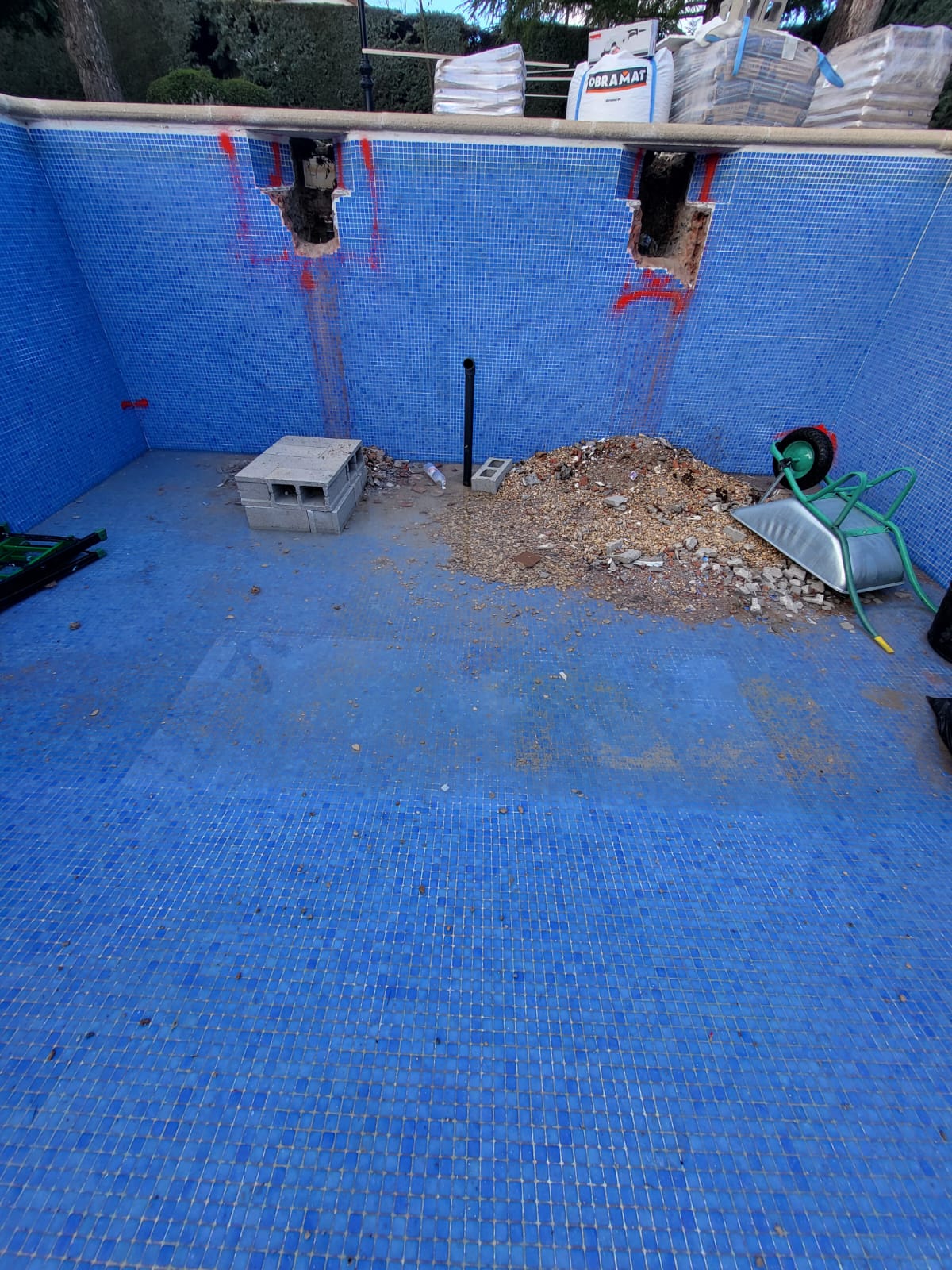 Renovación integral de piscina privada, con reducción de la profundidad del fondo para mayor confort y seguridad, y construcción de escalera de obra con banco corrido.