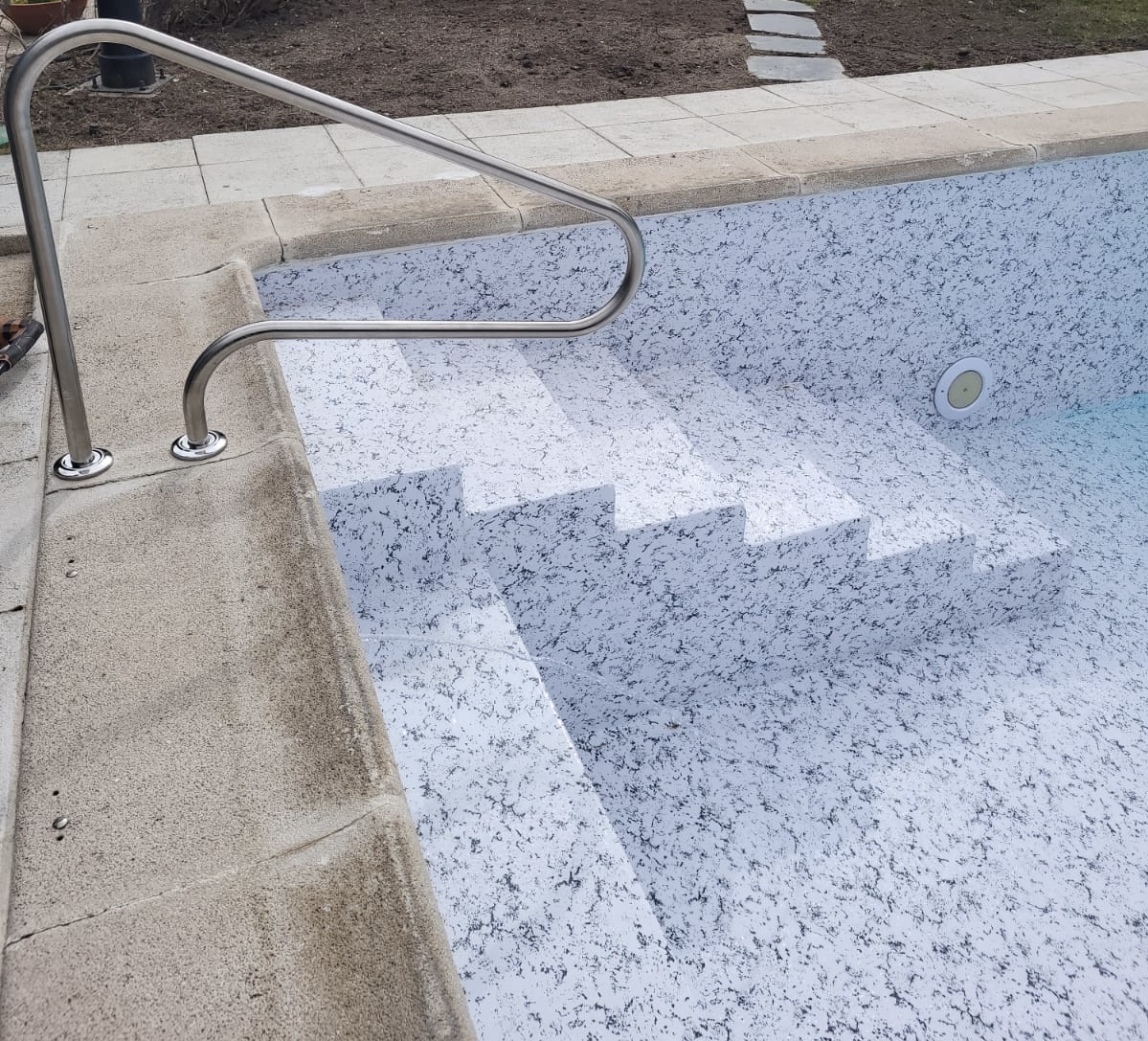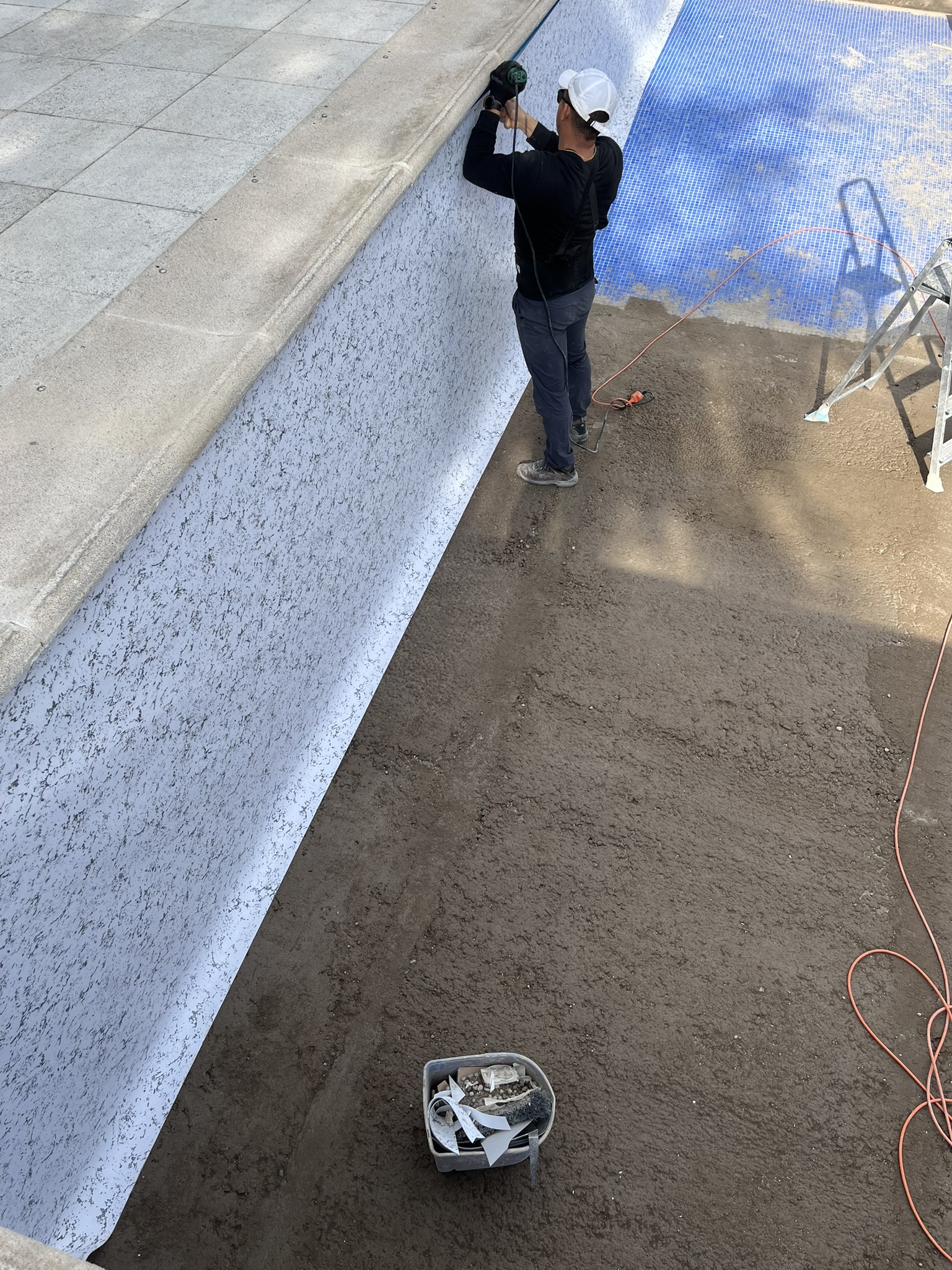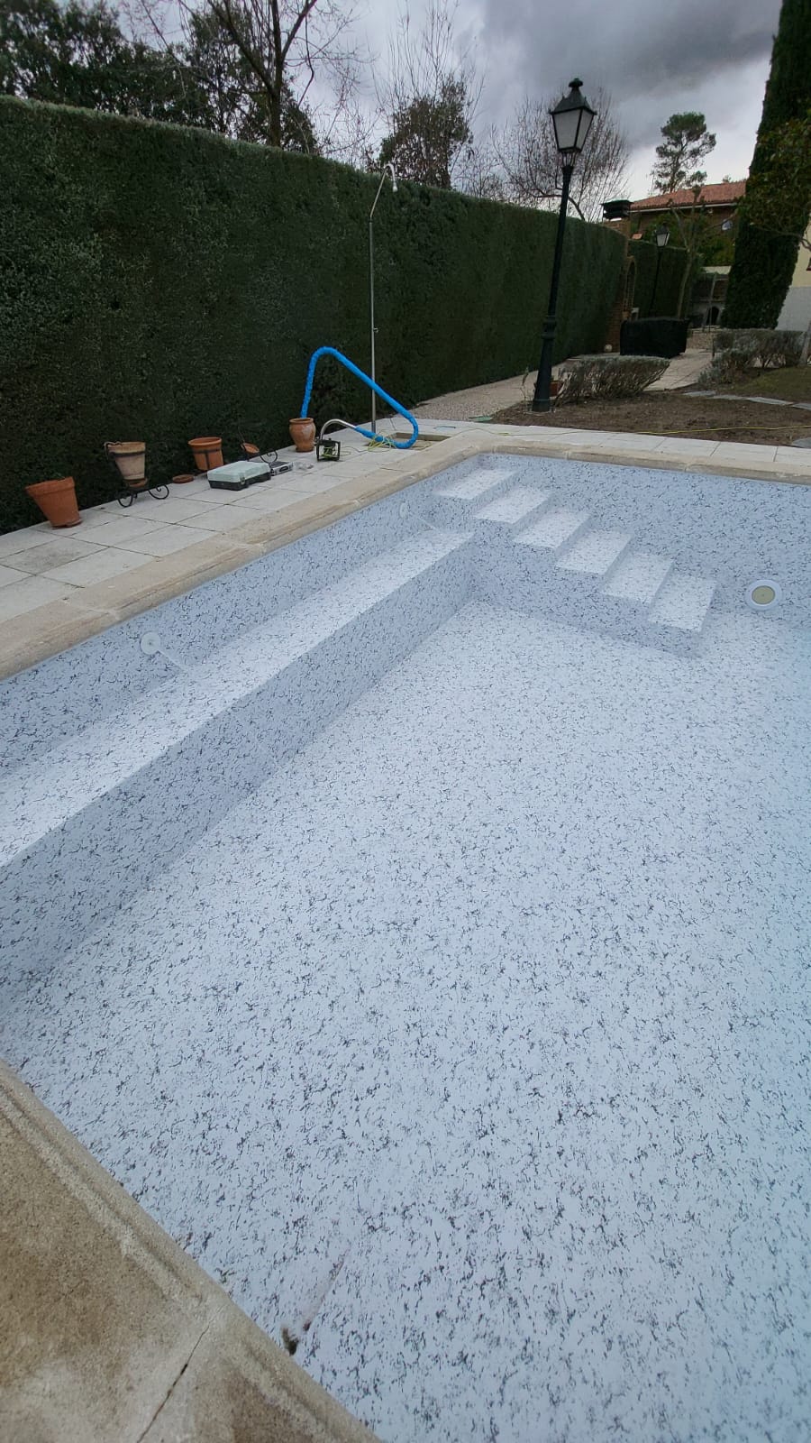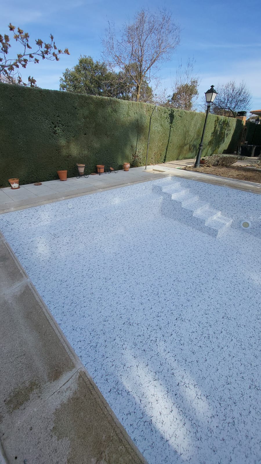 Renovación integral de piscina privada, con reducción de la profundidad del fondo para mayor confort y seguridad, y construcción de escalera de obra con banco corrido.
