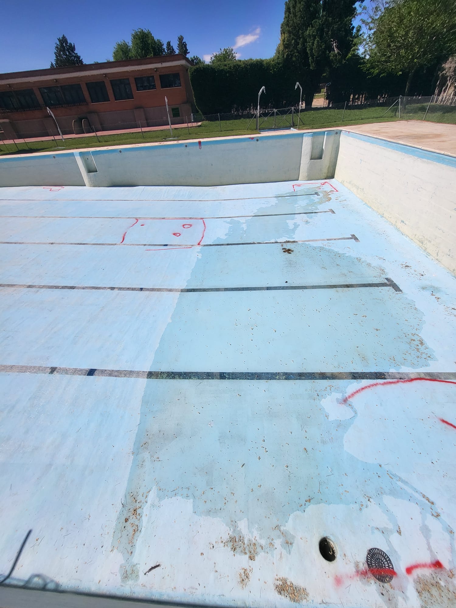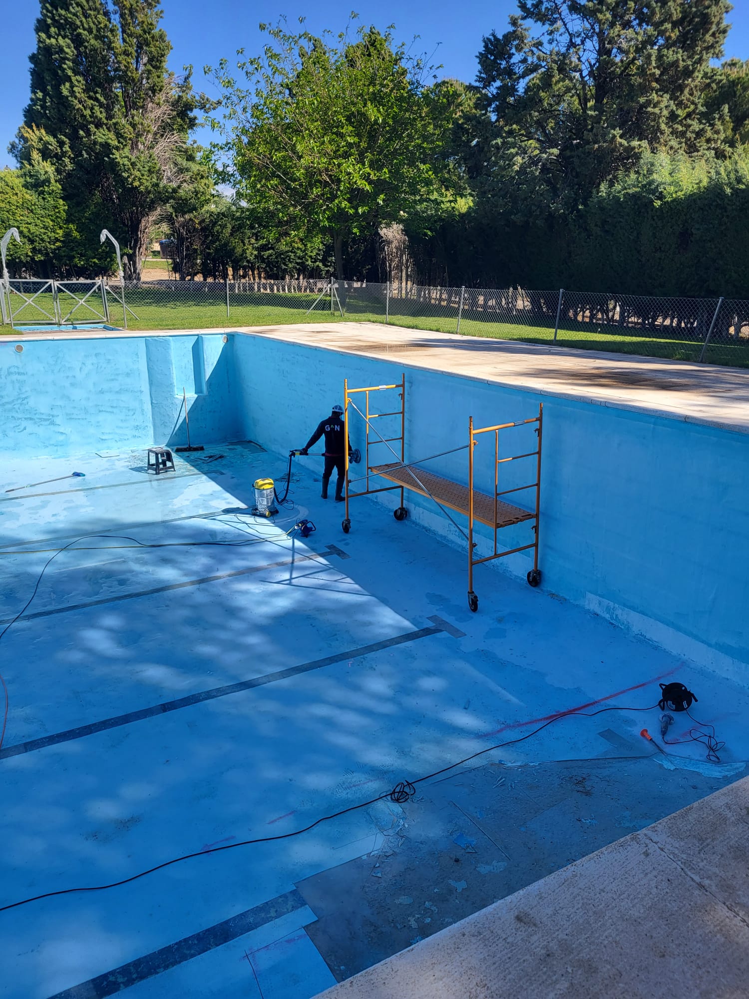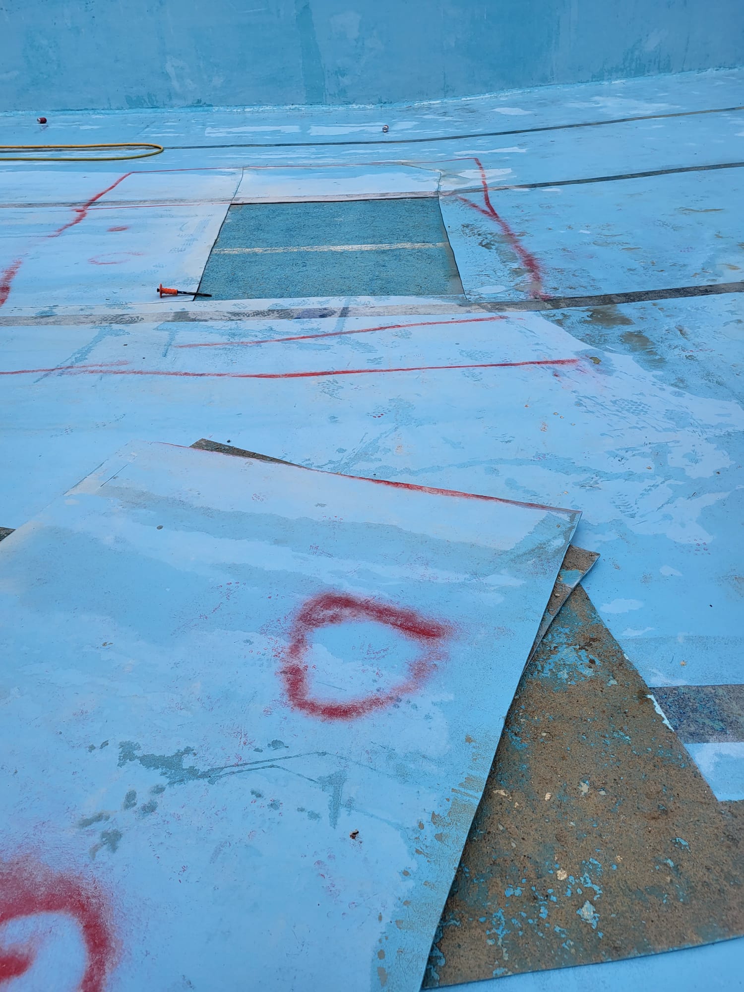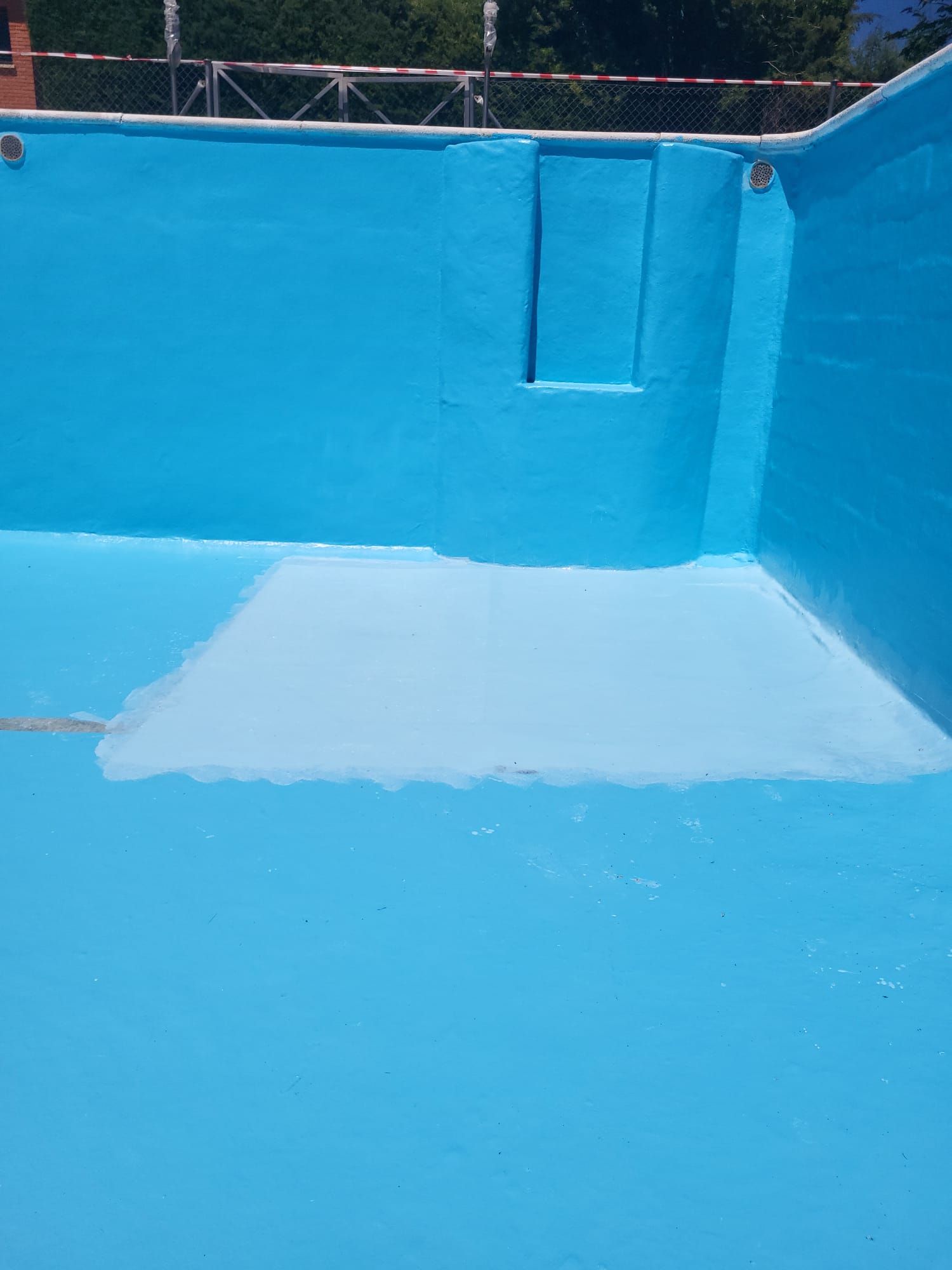 Rehabilitación de piscina comunitaria de fibra, mediante pintura con resina de poliéster y reparación de bolsas en el fondo del vaso, recuperando estanqueidad, resistencia y un acabado renovado.