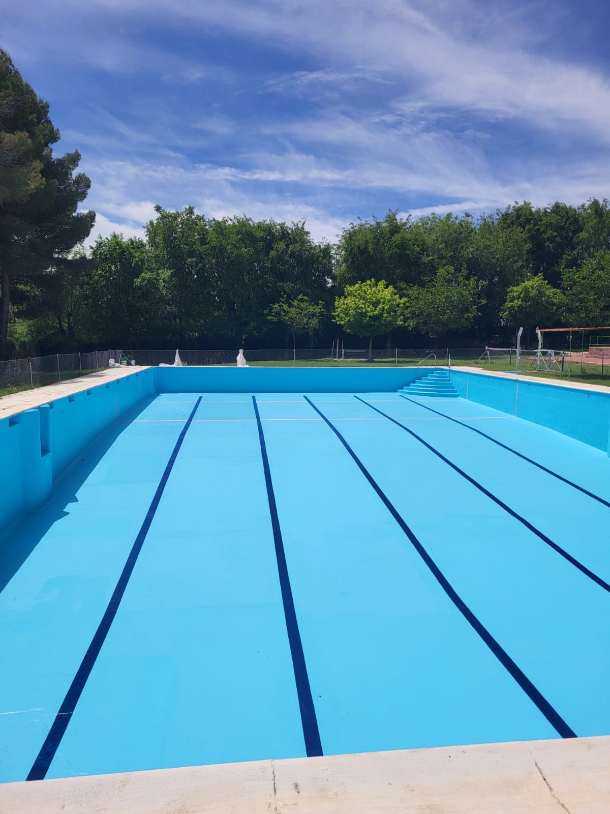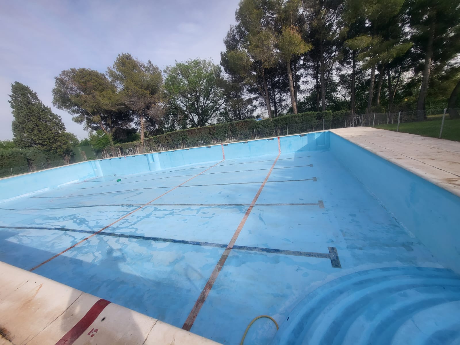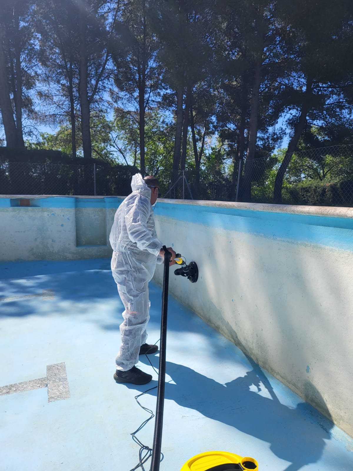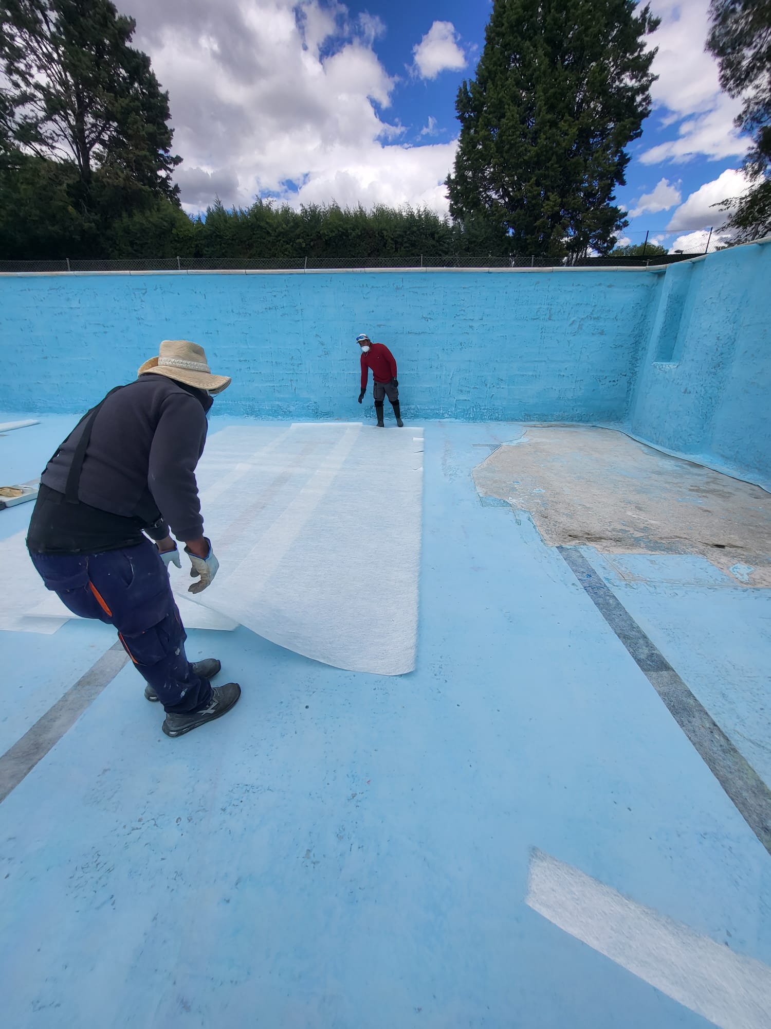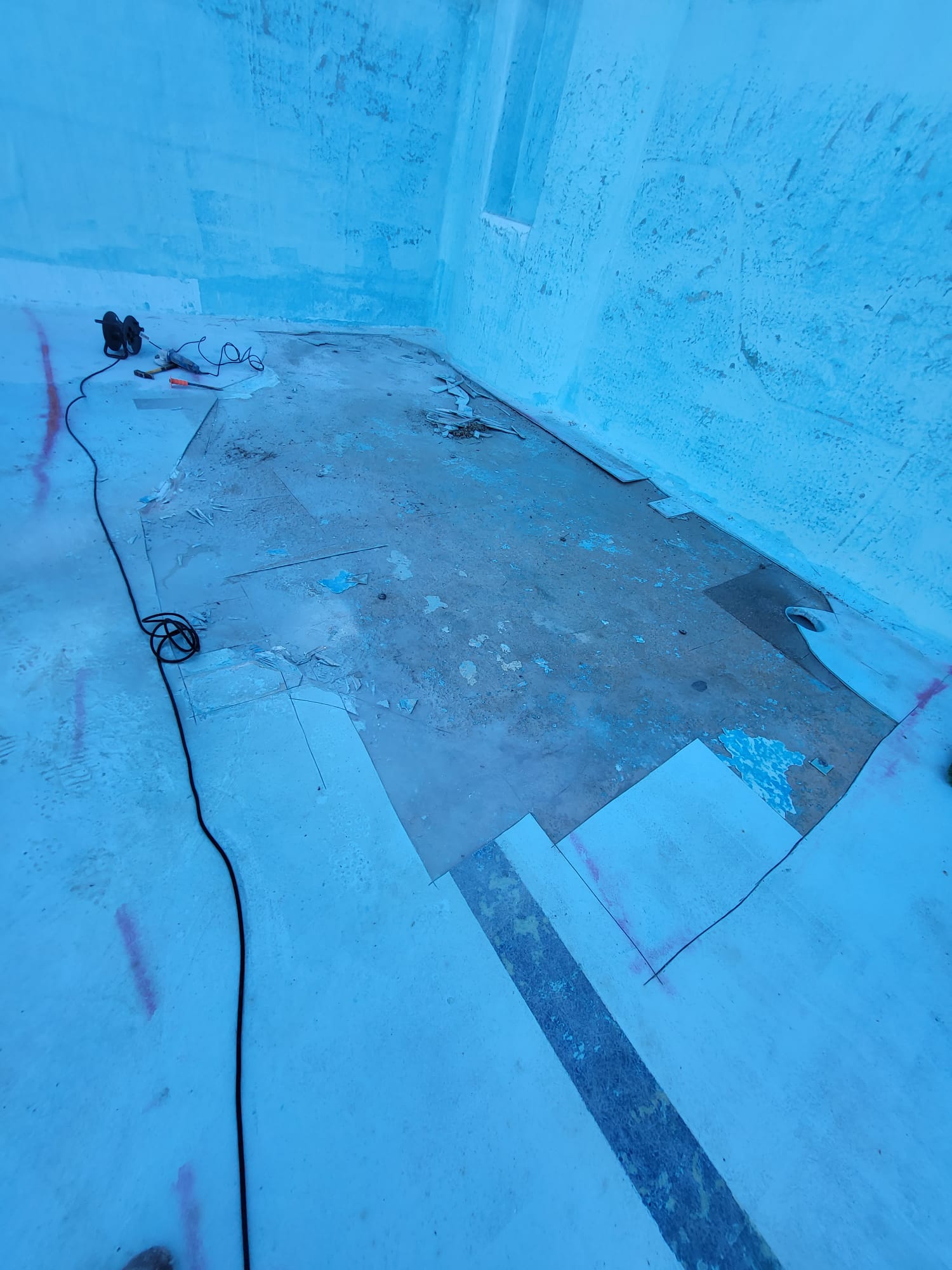 Rehabilitación de piscina comunitaria de fibra, mediante pintura con resina de poliéster y reparación de bolsas en el fondo del vaso, recuperando estanqueidad, resistencia y un acabado renovado.