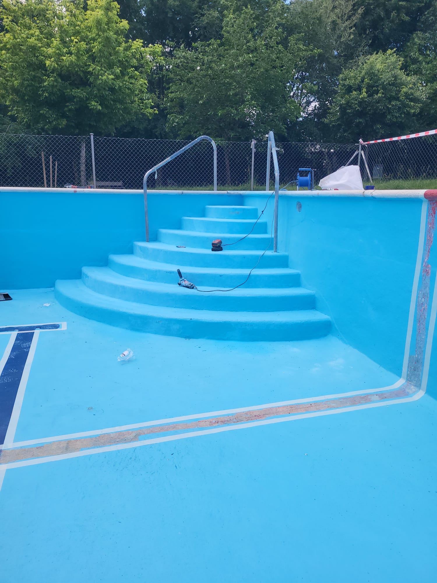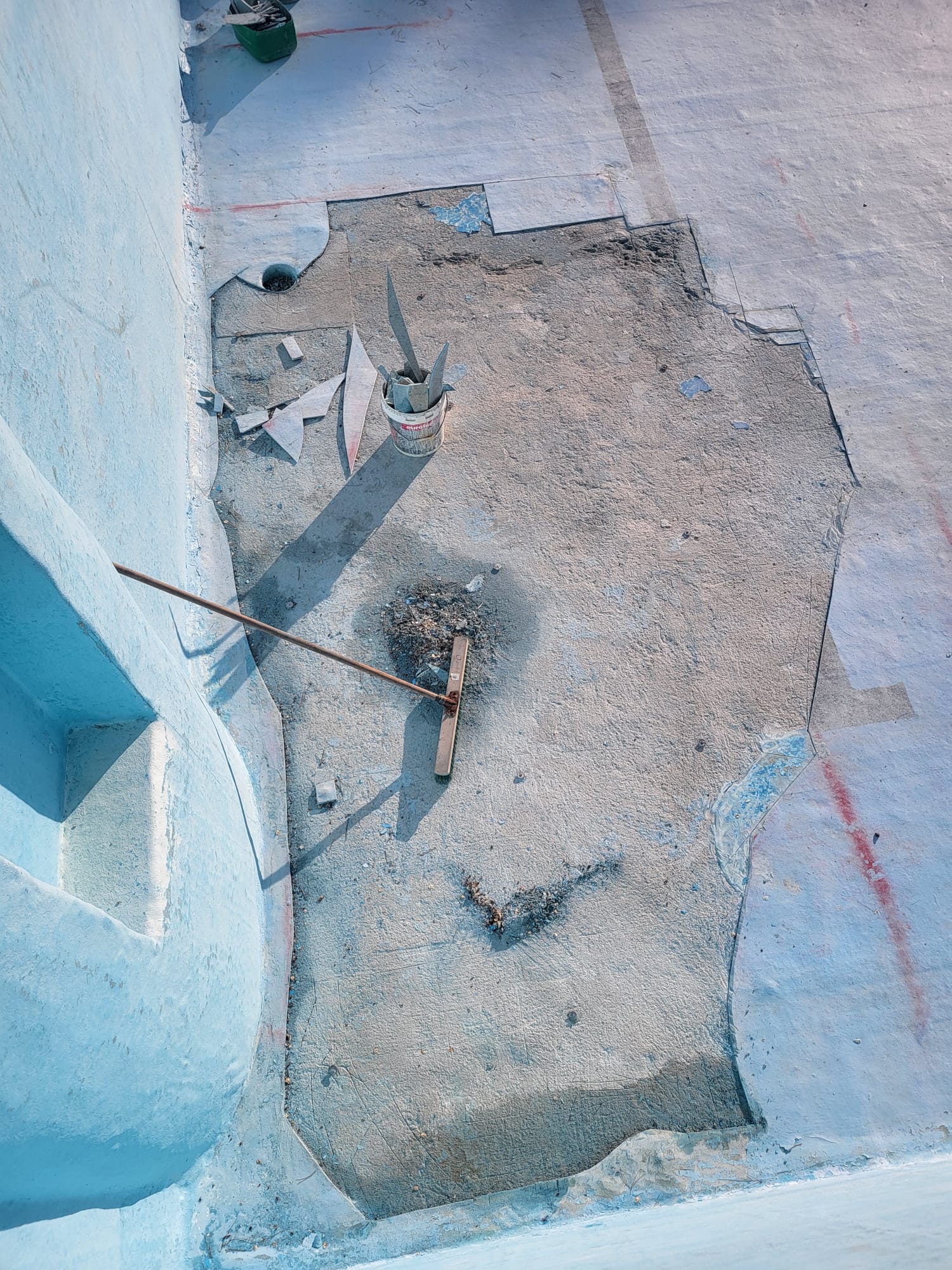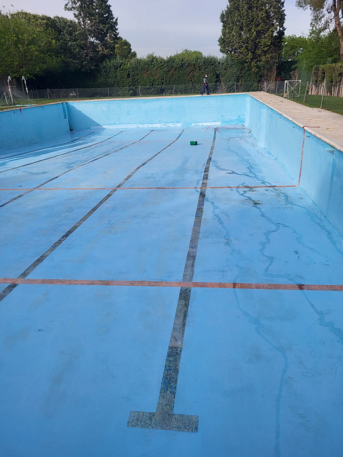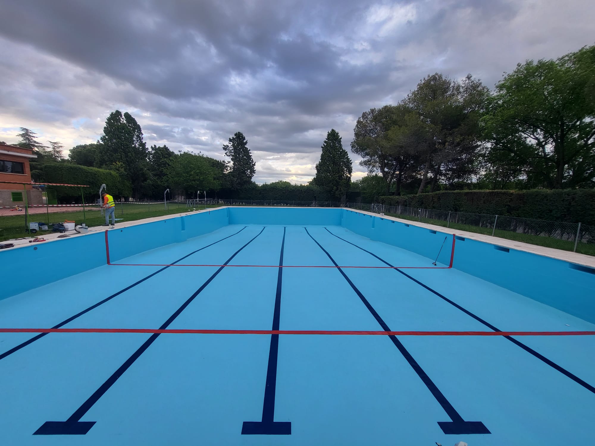 Rehabilitación de piscina comunitaria de fibra, mediante pintura con resina de poliéster y reparación de bolsas en el fondo del vaso, recuperando estanqueidad, resistencia y un acabado renovado.