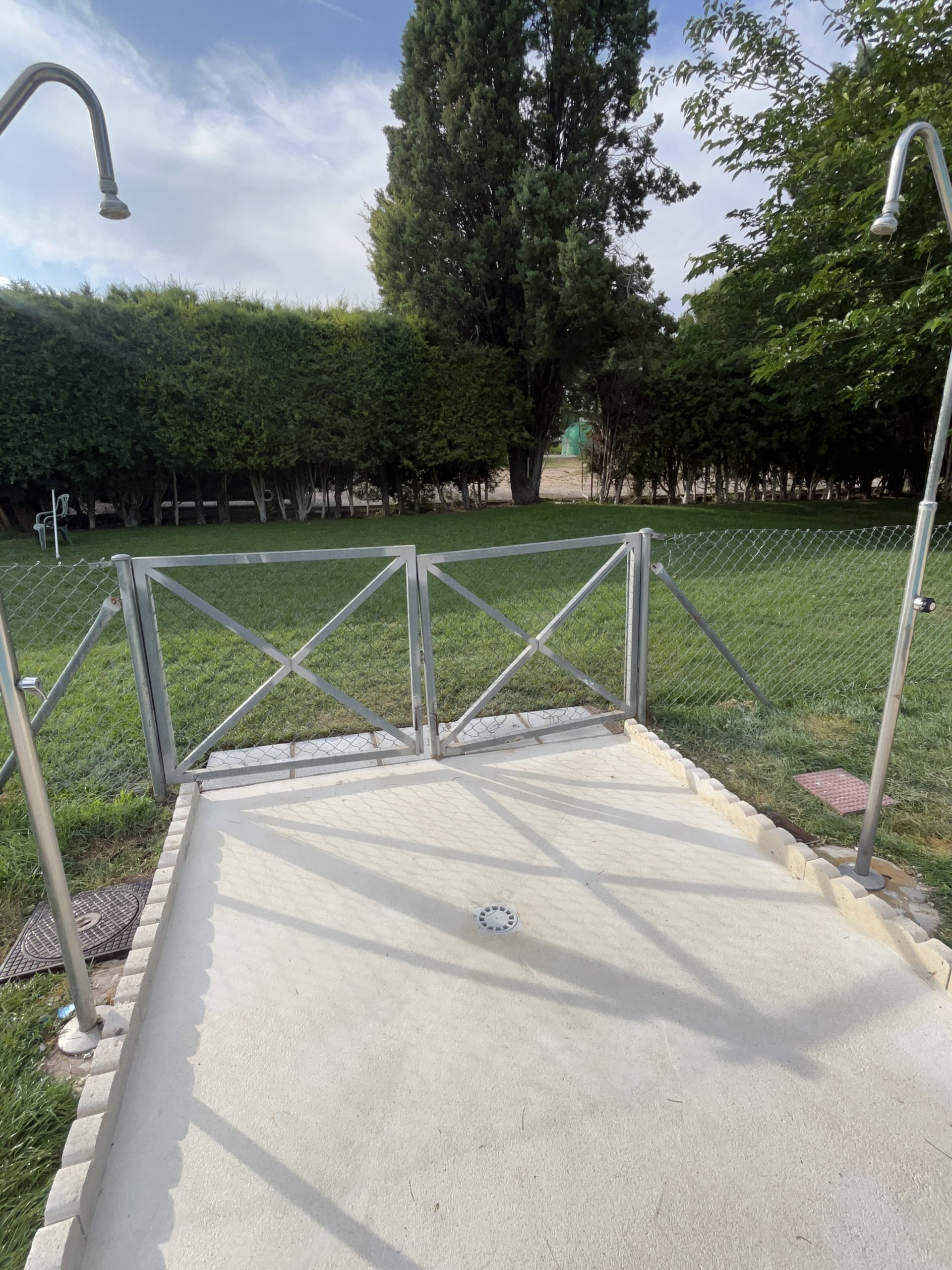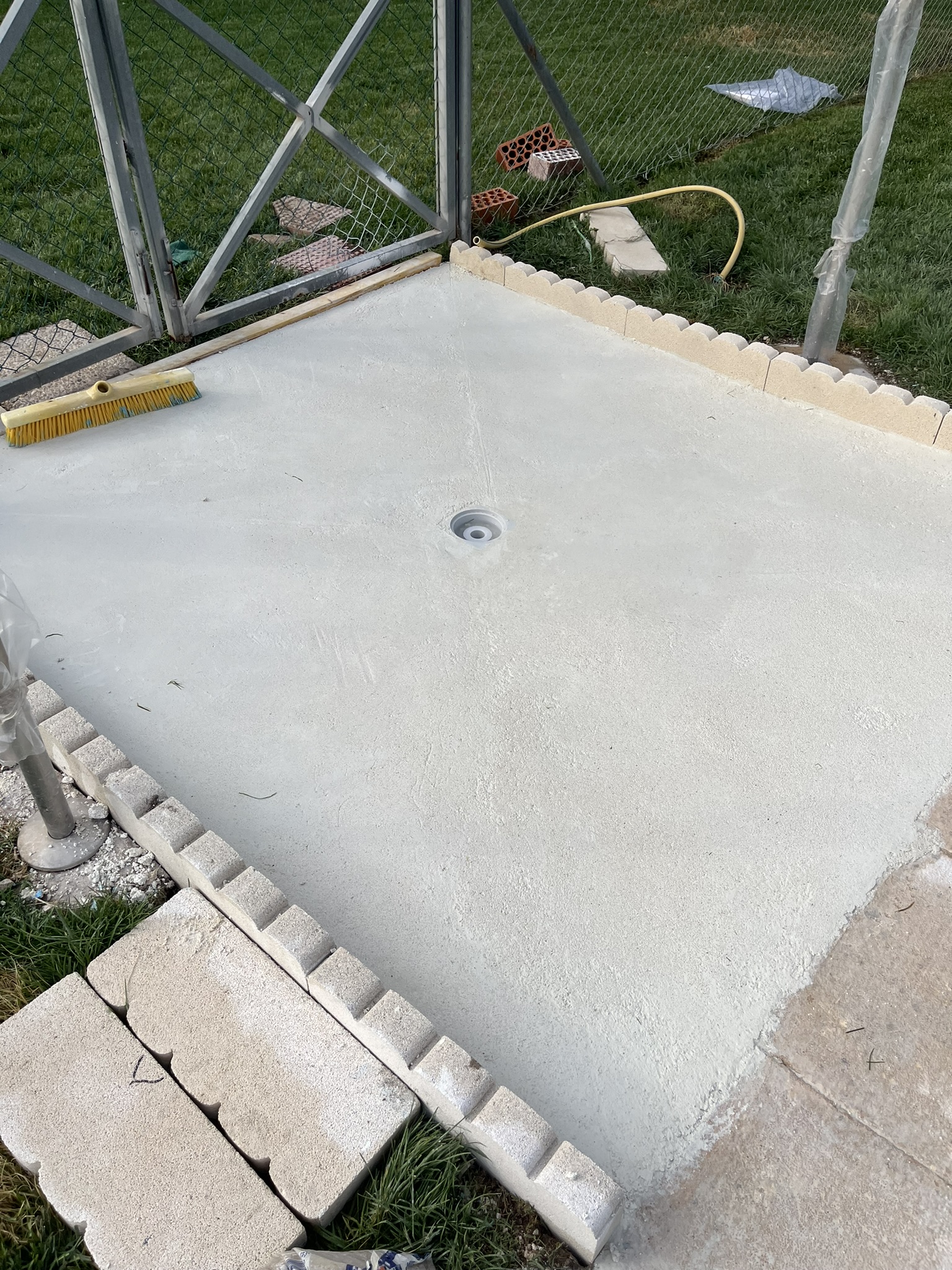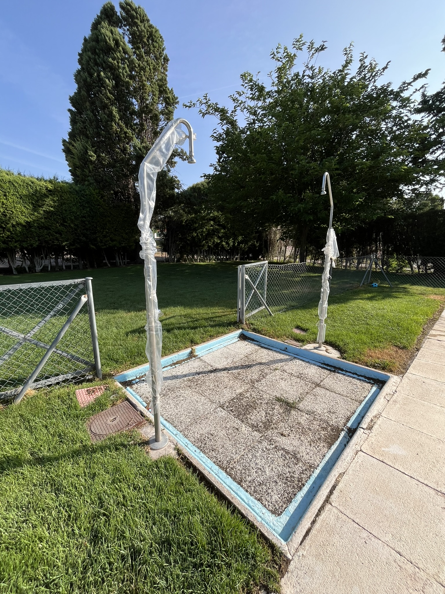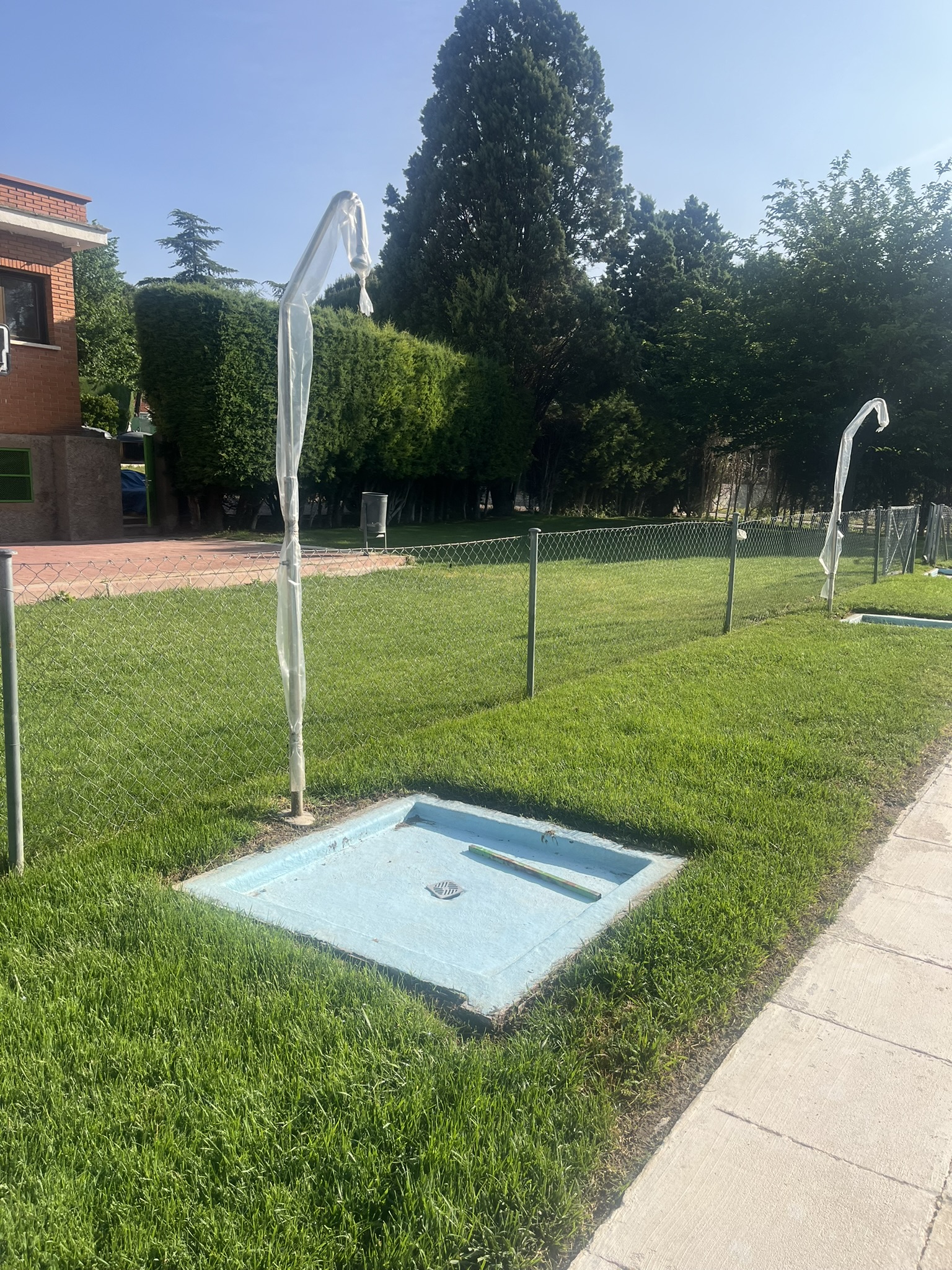 Rehabilitación de piscina comunitaria de fibra, mediante pintura con resina de poliéster y reparación de bolsas en el fondo del vaso, recuperando estanqueidad, resistencia y un acabado renovado.